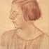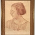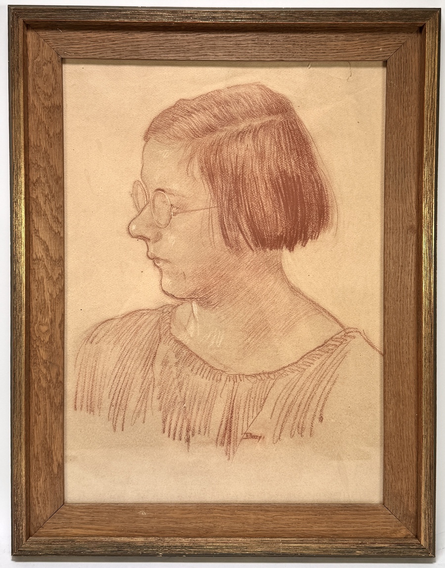 Portrettekening in krijt op papier door Reinhart Dozy (1880–1947), ca. 1920–1935, voorstellende een jonge vrouw met bril in profiel. Gesigneerd midden onder, de tekening is ingelijst in een houten lijst.
