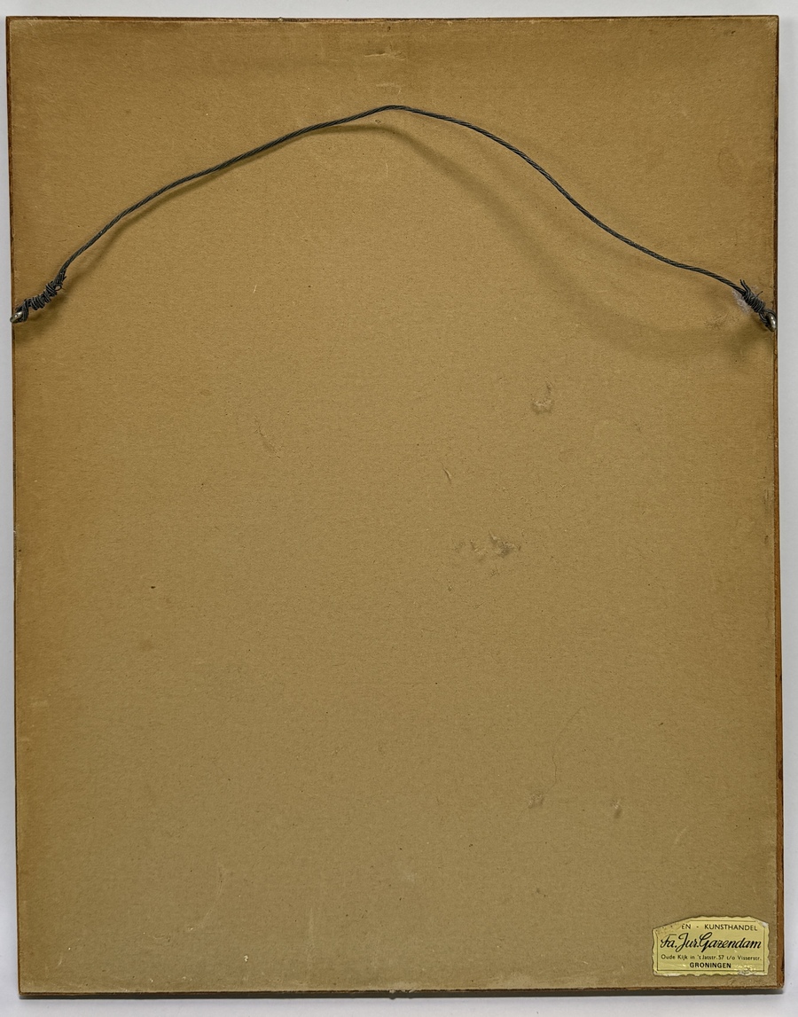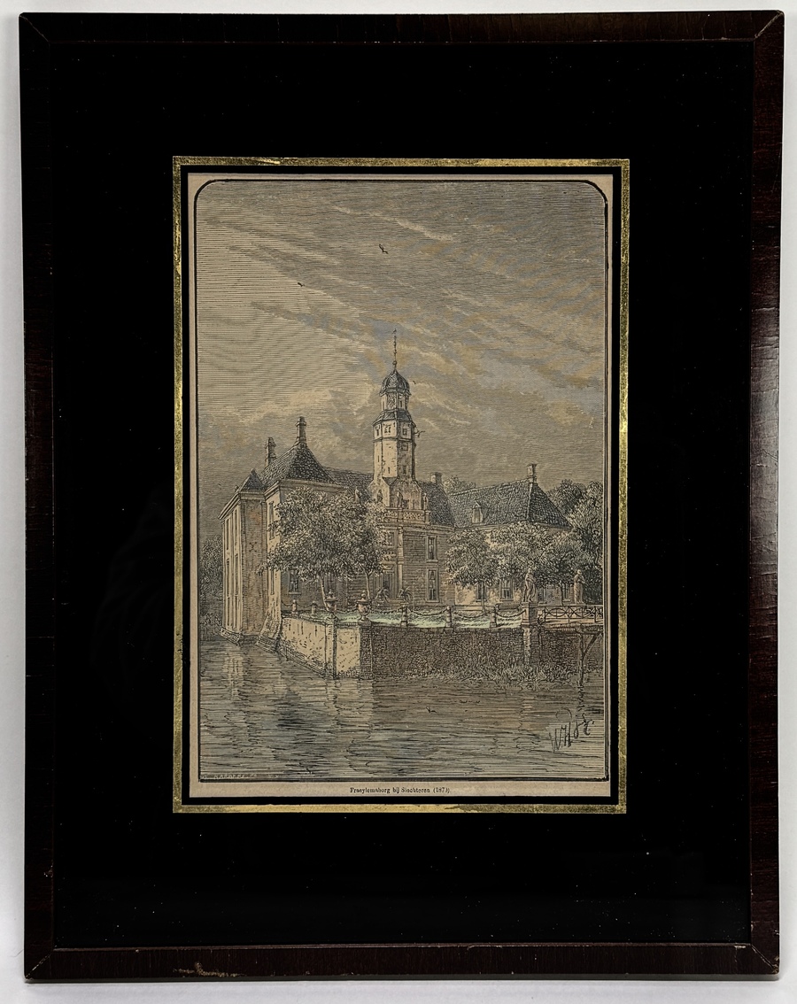 Houtgravure door Pieter Herman Witkamp (1816–1892) toont de Fraeylemaborg bij Slochteren in academisch realistische stijl, handgekleurd op papier. De gedetailleerde weergave van de borg met centrale toren en omliggende waterpartij is kenmerkend voor de topografische illustraties uit 1870. Gesigneerd linksonder in de plaat. De houtgravure heeft een Nederlandse herkomst en is geplaatst in een zwarte lijst met goudkleurige bies. Kom langs tijdens de kijkdagen (10 t/m 12 april) en ontdek deze houtgravure zelf! |