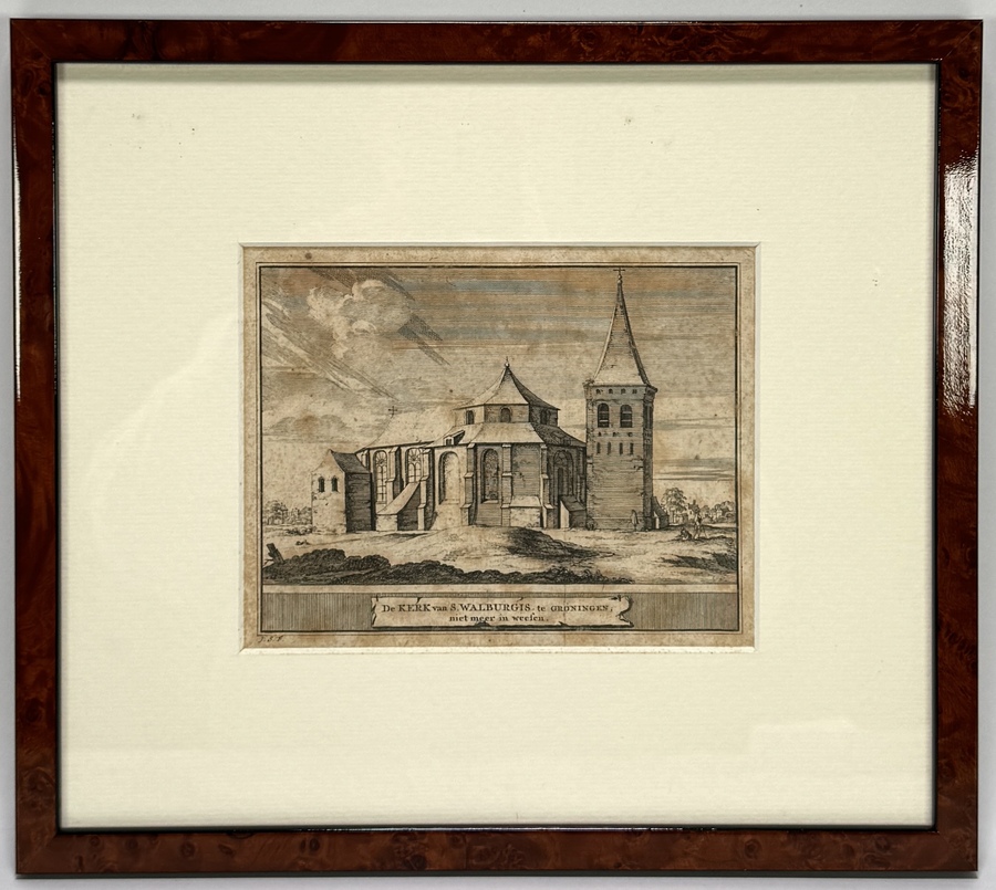 Gravure toont de verdwenen Sint-Walburgkerk te Groningen in barokstijl. De topografische voorstelling met architectuur en fijnmazige lijnenvoering in de luchtpartij is karakteristiek. Met cartouche-onderschrift en monogram J.S.F. linksonder. De gravure dateert uit 1774 en heeft een Nederlandse herkomst, afkomstig uit de Schatkamer der Nederlandsche oudheden. In de plaat getiteld en gesigneerd met initialen, uitgegeven door Gerrit Bom in 1774 naar een compositie uit 1711. Registreer nu en bied eenvoudig online mee op deze gravure! |