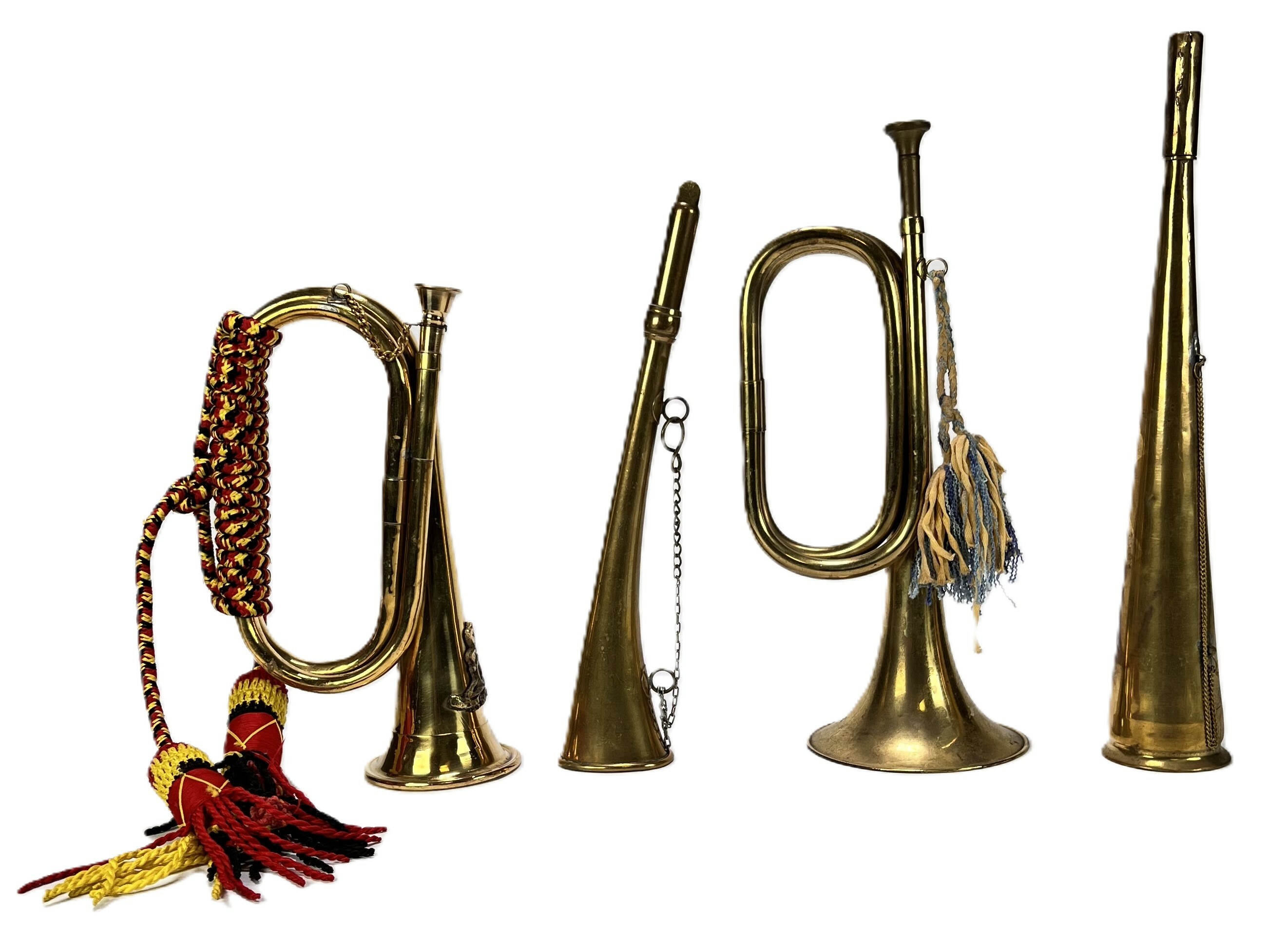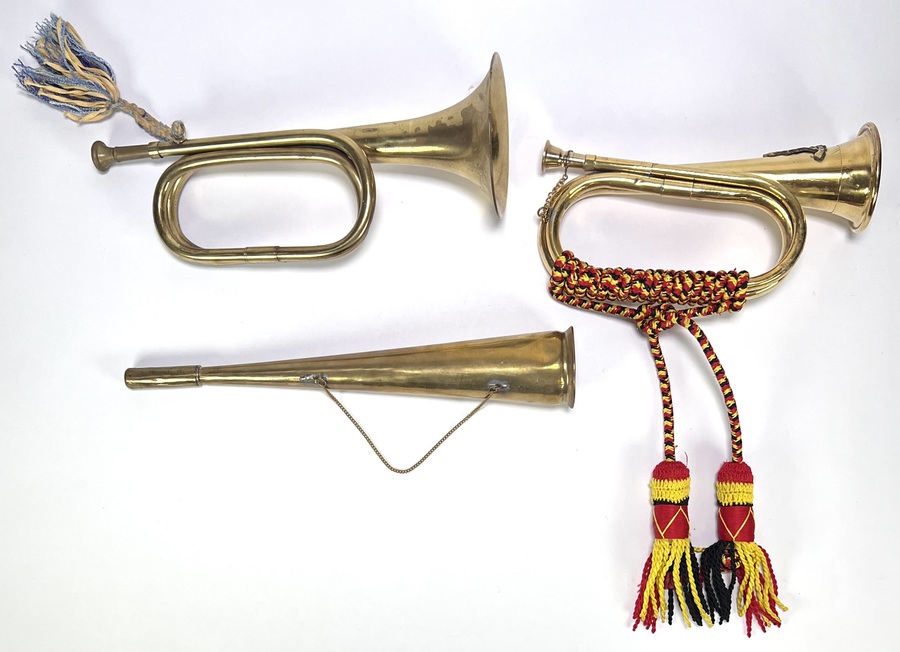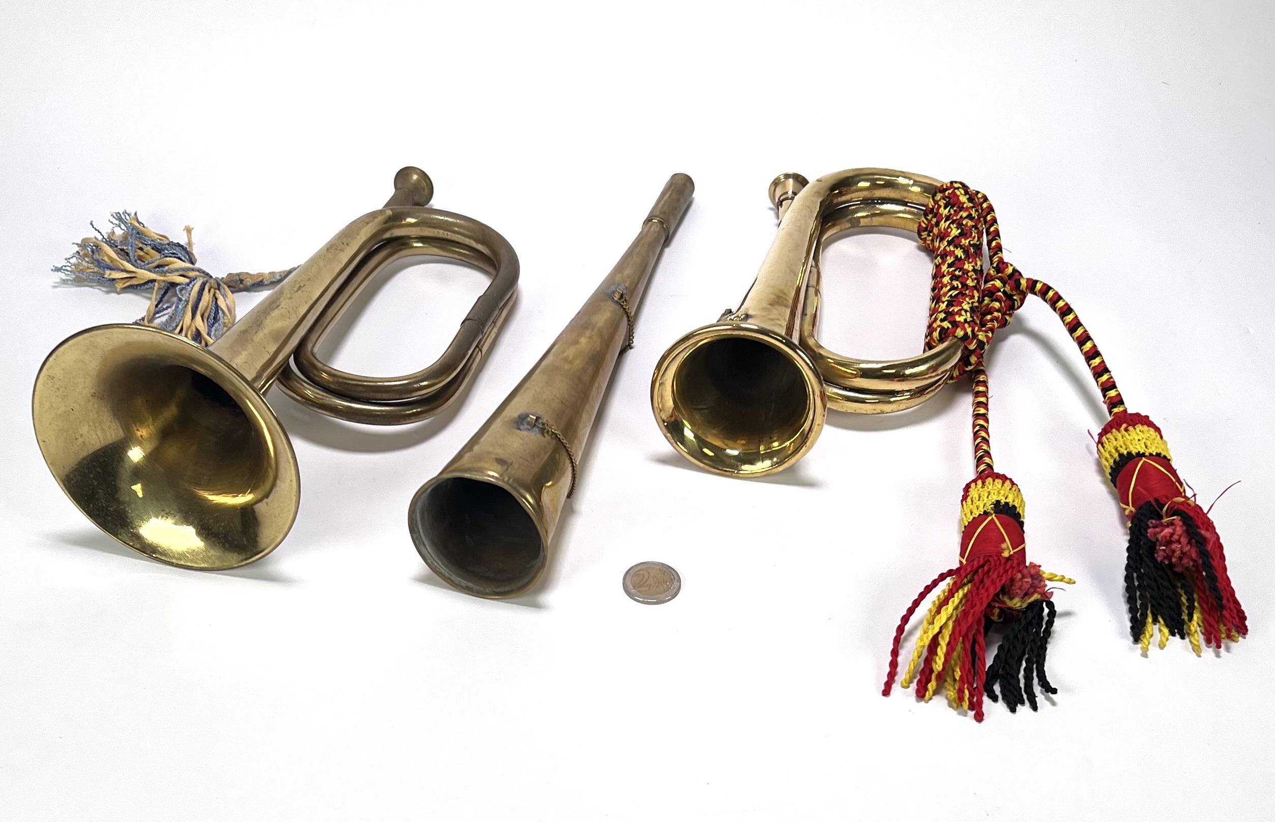 Vier verschillende toeters van messing, vervaardigd met gedreven en gesoldeerde buisvormen. Bestaand uit twee scheepstoeters met uitlopende beker en lus en twee toeters voorzien van textiele koorden en kwasten in diverse kleurencombinaties, waaronder de Belgische nationale driekleur. De vormgeving wijst op ceremonieel of militair gebruik. Het geheel dateert uit de eerste helft van de 20e eeuw en heeft een Europese herkomst. Geïnteresseerd? Bezoek onze kijkdagen van 11:00 tot 17:00 uur! |