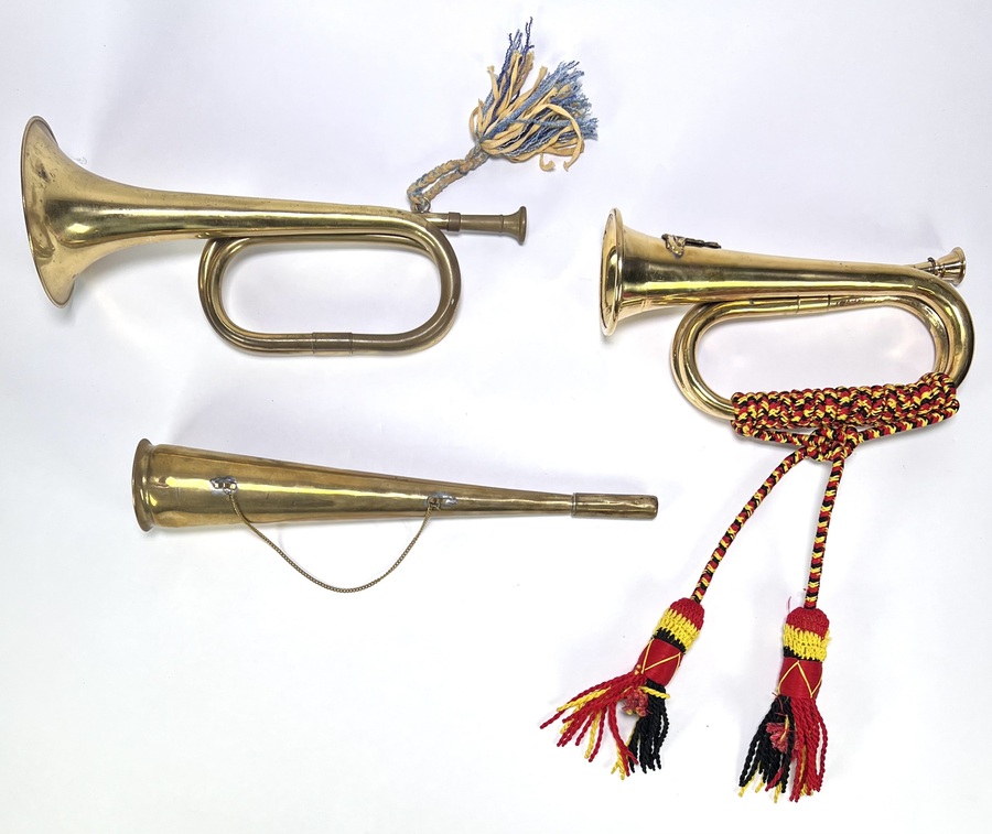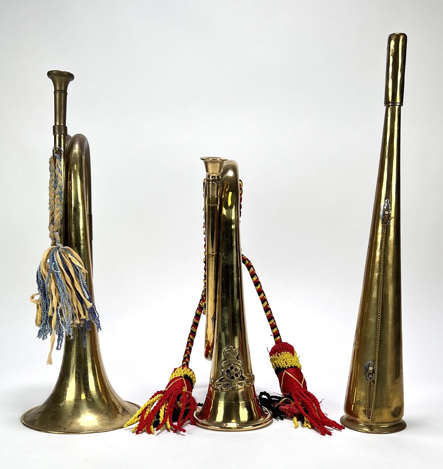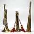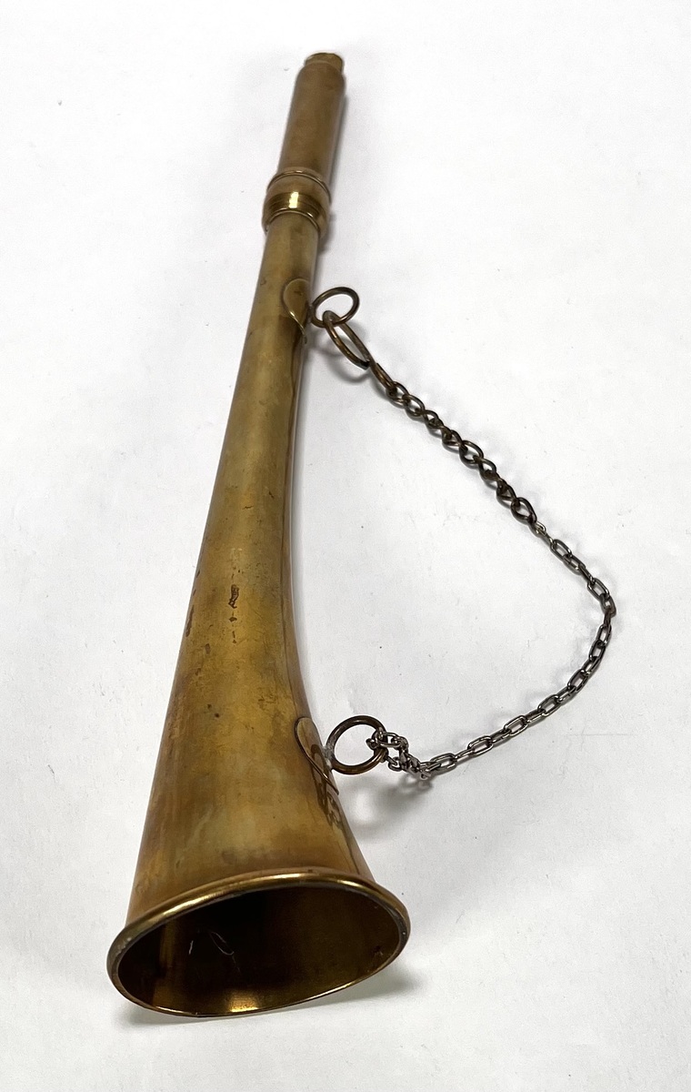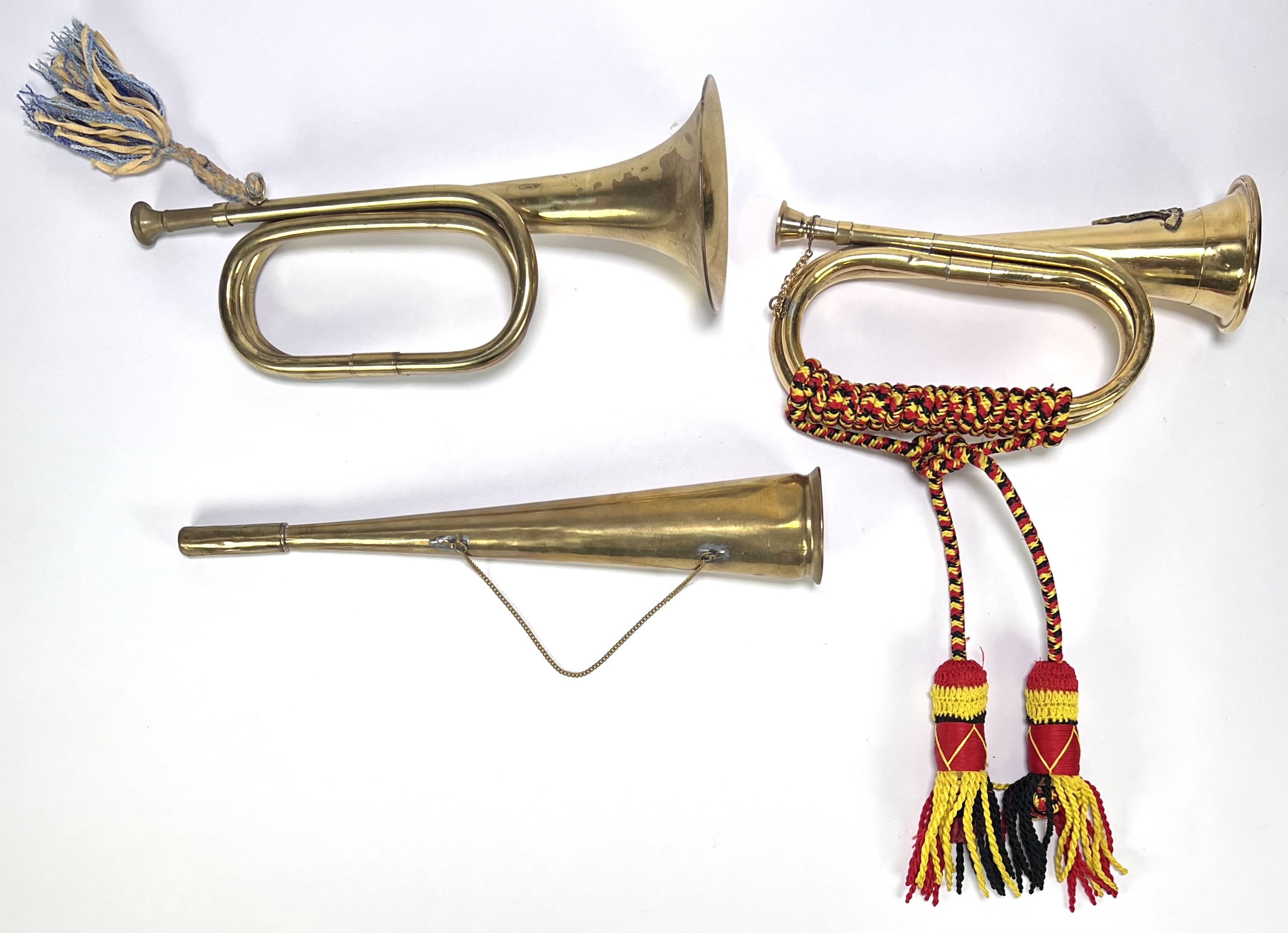 Vier verschillende toeters van messing, vervaardigd met gedreven en gesoldeerde buisvormen. Bestaand uit twee scheepstoeters met uitlopende beker en lus en twee toeters voorzien van textiele koorden en kwasten in diverse kleurencombinaties, waaronder de Belgische nationale driekleur. De vormgeving wijst op ceremonieel of militair gebruik. Het geheel dateert uit de eerste helft van de 20e eeuw en heeft een Europese herkomst. Geïnteresseerd? Bezoek onze kijkdagen van 11:00 tot 17:00 uur! |