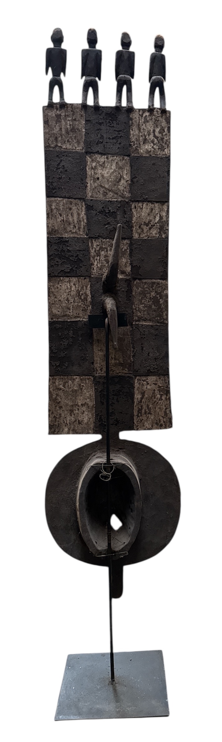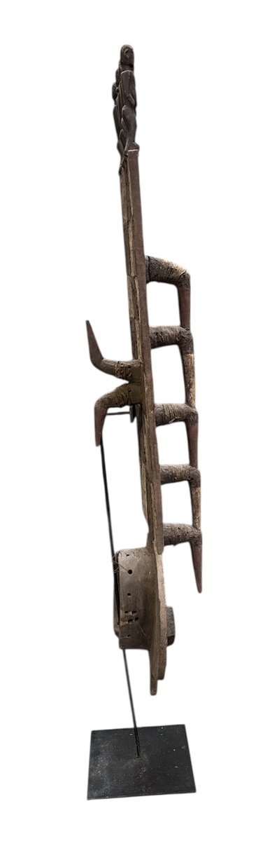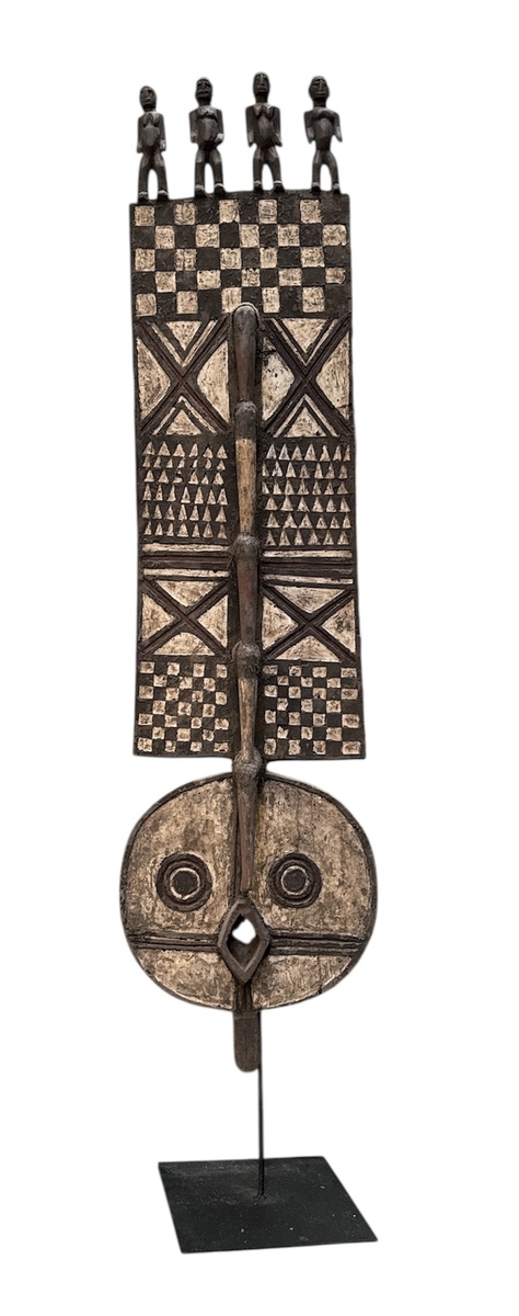 Bwa Nwantantay plankmasker uit Burkina Faso, midden 20e eeuw, uitgevoerd in gesneden en polychroom beschilderd hout. Het masker toont geometrische patronen en is bekroond met vier gestileerde menselijke figuren, met verweerde pigmentatie en artisanale snijwijze. Het masker fungeerde als een spiritueel statusobject tijdens ceremoniële dorpsrituelen. Klaar om te bieden? Registreer je nu en doe mee aan de veiling! |