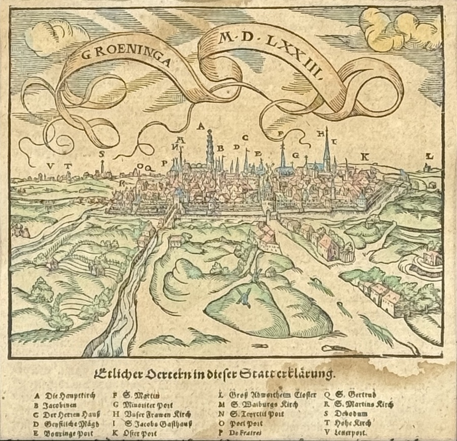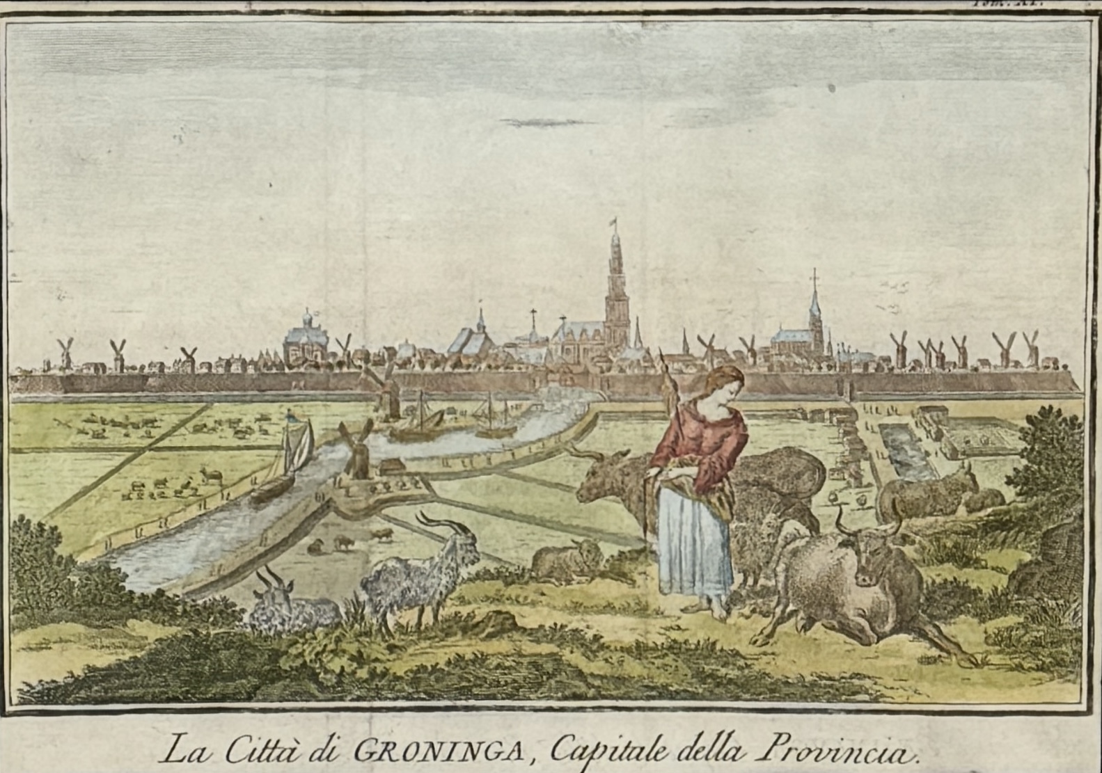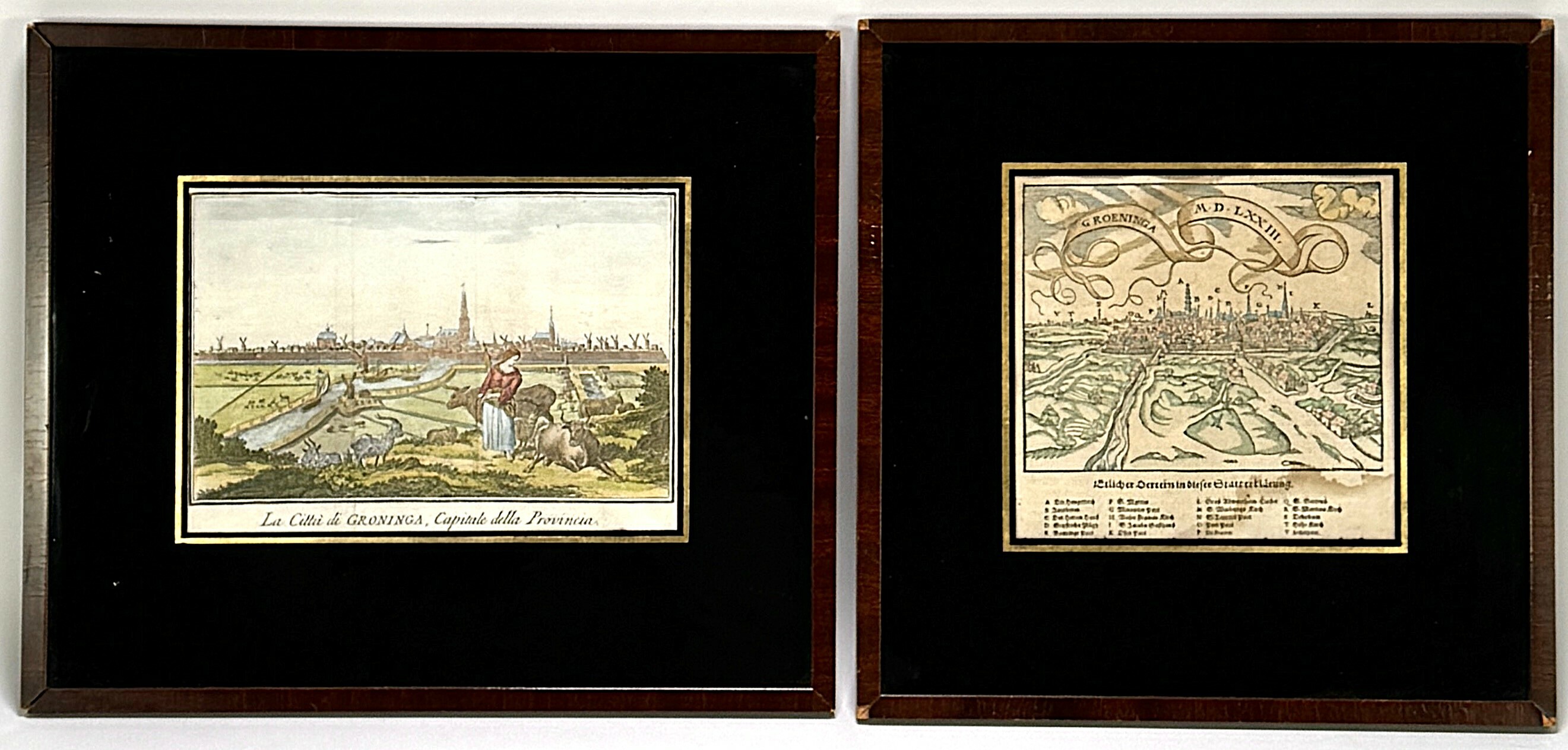 Kaarten van Sebastian Münster (1488–1552) en een Italiaanse kaart (1679–1767) tonen Groningen in twee historische stadsgezichten uit de barokperiode, uitgevoerd als handgekleurde houtsnede en kopergravure op papier. De kavel combineert een ommuurde skyline met letterlegenda en een panoramisch stadsprofiel met vee, molens en waterloop. De kaarten dateren uit circa 1573–1743 en hebben een Europese herkomst. Geïnteresseerd? Bezoek onze kijkdagen op 10, 11 en 12 april van 11:00 tot 17:00 uur! |