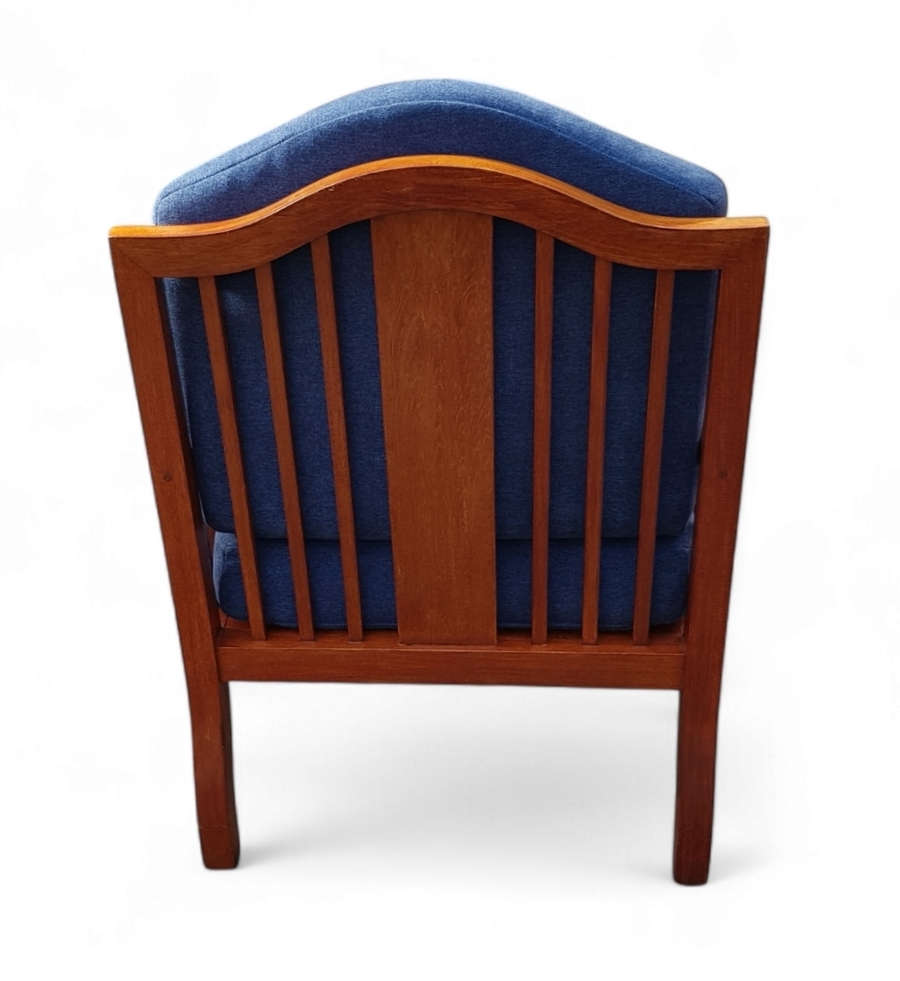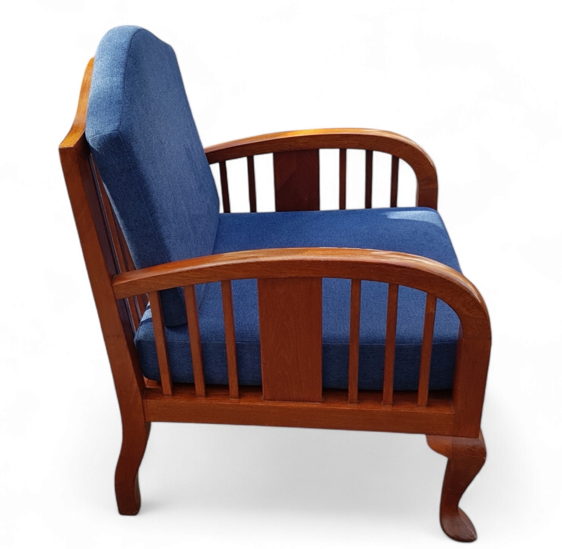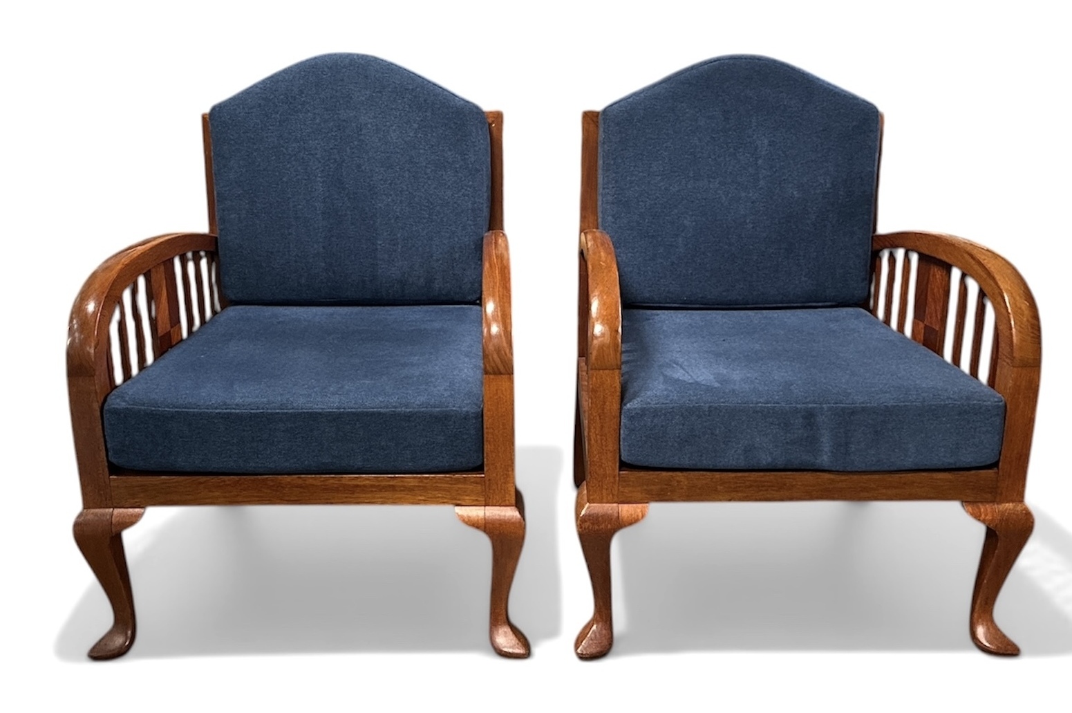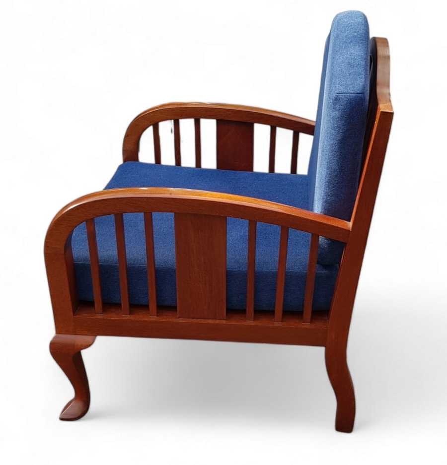 Twee stoelen uit de Art Deco periode, vervaardigd uit djatihout met blauwe textiele stoffering. De koloniale meubelen tonen gebogen armleuningen met een centrale paneelvulling tussen verticale spijlen en rusten op cabriole voorpoten. De vormgeving combineert westerse Art Deco invloeden met de ambachtelijke traditie van Nederlands-Indië. De stoelen dateren uit circa 1930 en hebben een herkomst in het voormalige Nederlands-Indië. Geïnteresseerd? Bezoek onze kijkdagen op 10, 11 en 12 april van 11:00 tot 17:00 uur! |