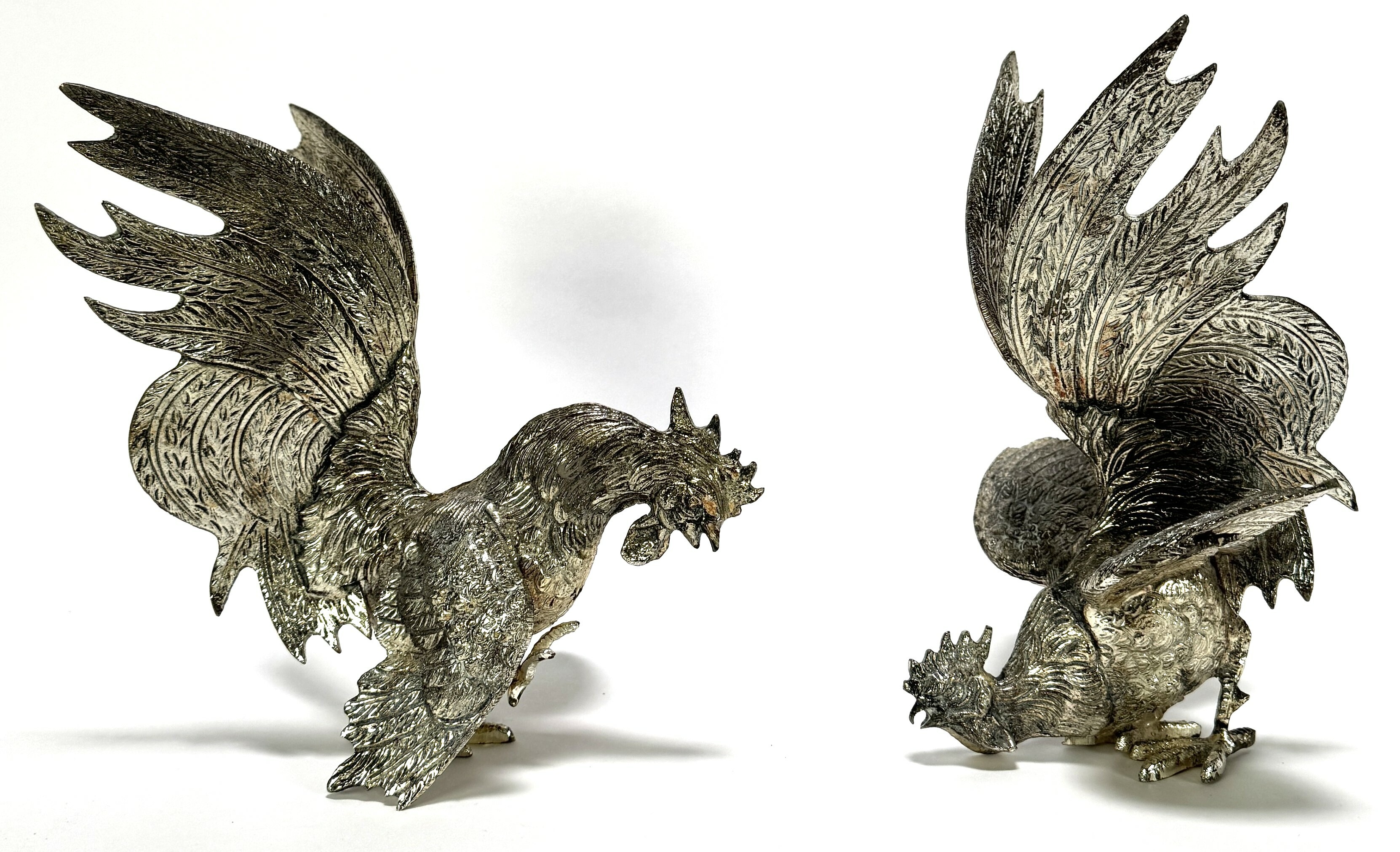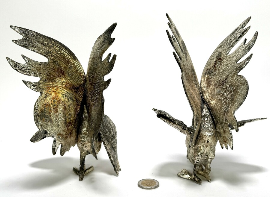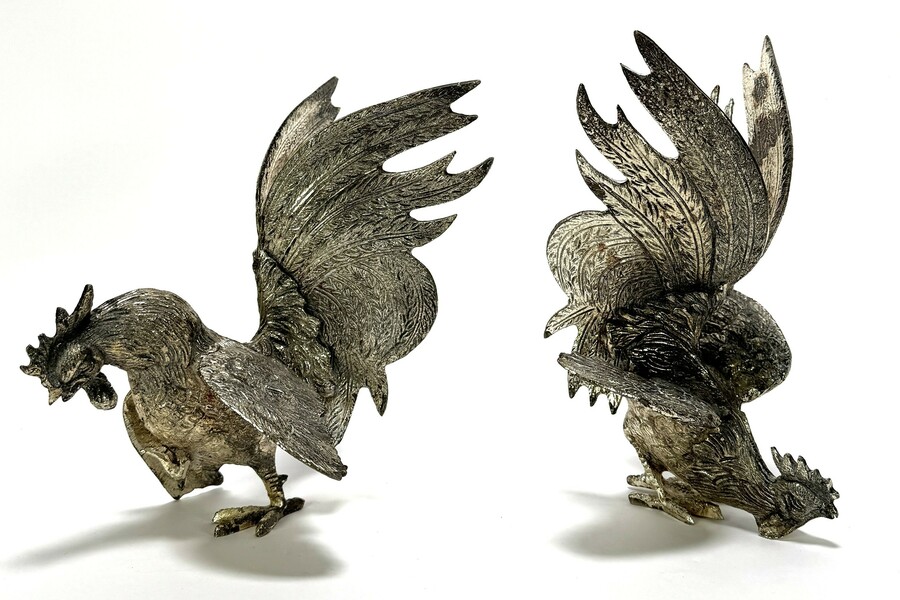 Verzilverde tafelstukken - vechtende hanen, 20e eeuw