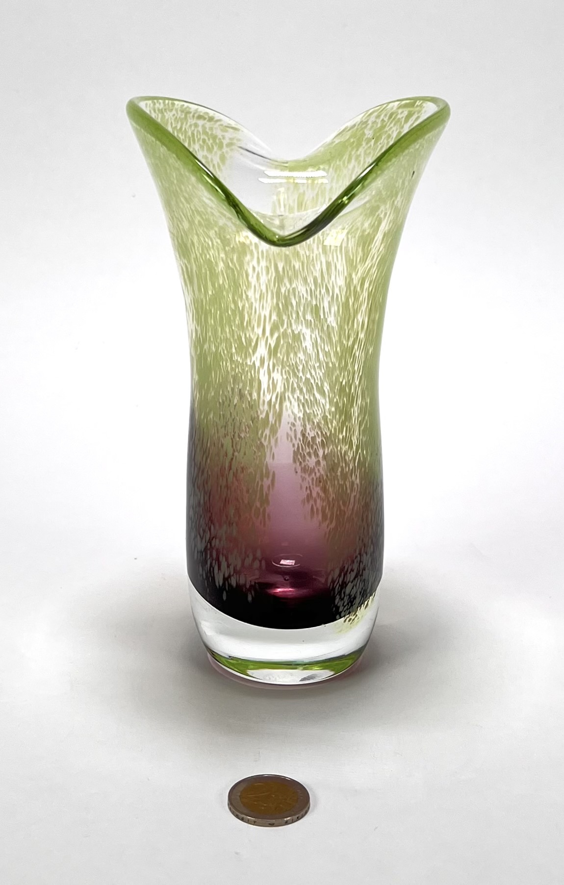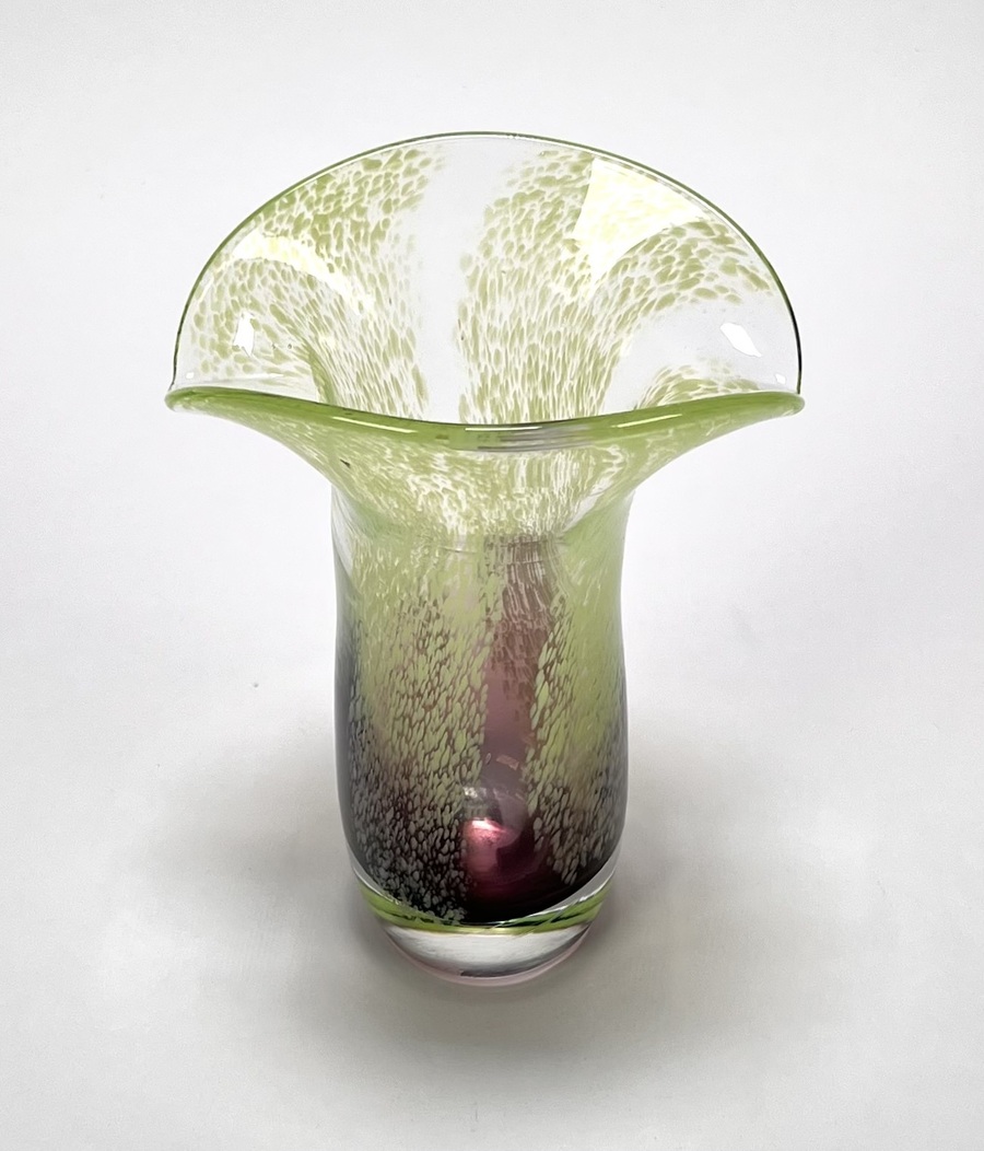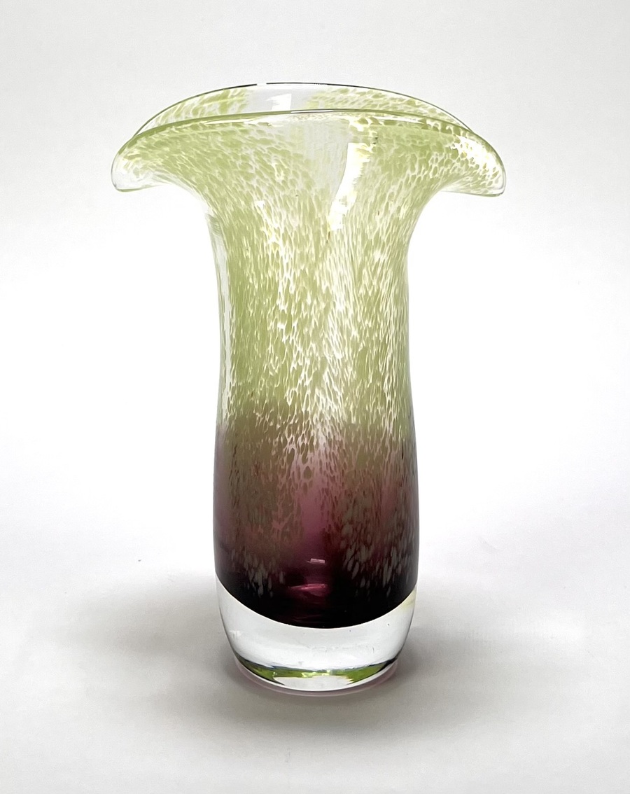 Vaas uit de Mid-century modern periode, vervaardigd uit mond geblazen glas met een karakteristiek kleurverloop van diep amethist naar limegroen. De bovenzijde toont een dicht fritdecor van witte en groene glasinsluitingen, uitlopend in een golvende, waaierachtige rand. Datering circa 1970, Europese herkomst. Klaar om te bieden? Registreer je nu en doe mee aan de veiling! |