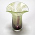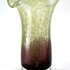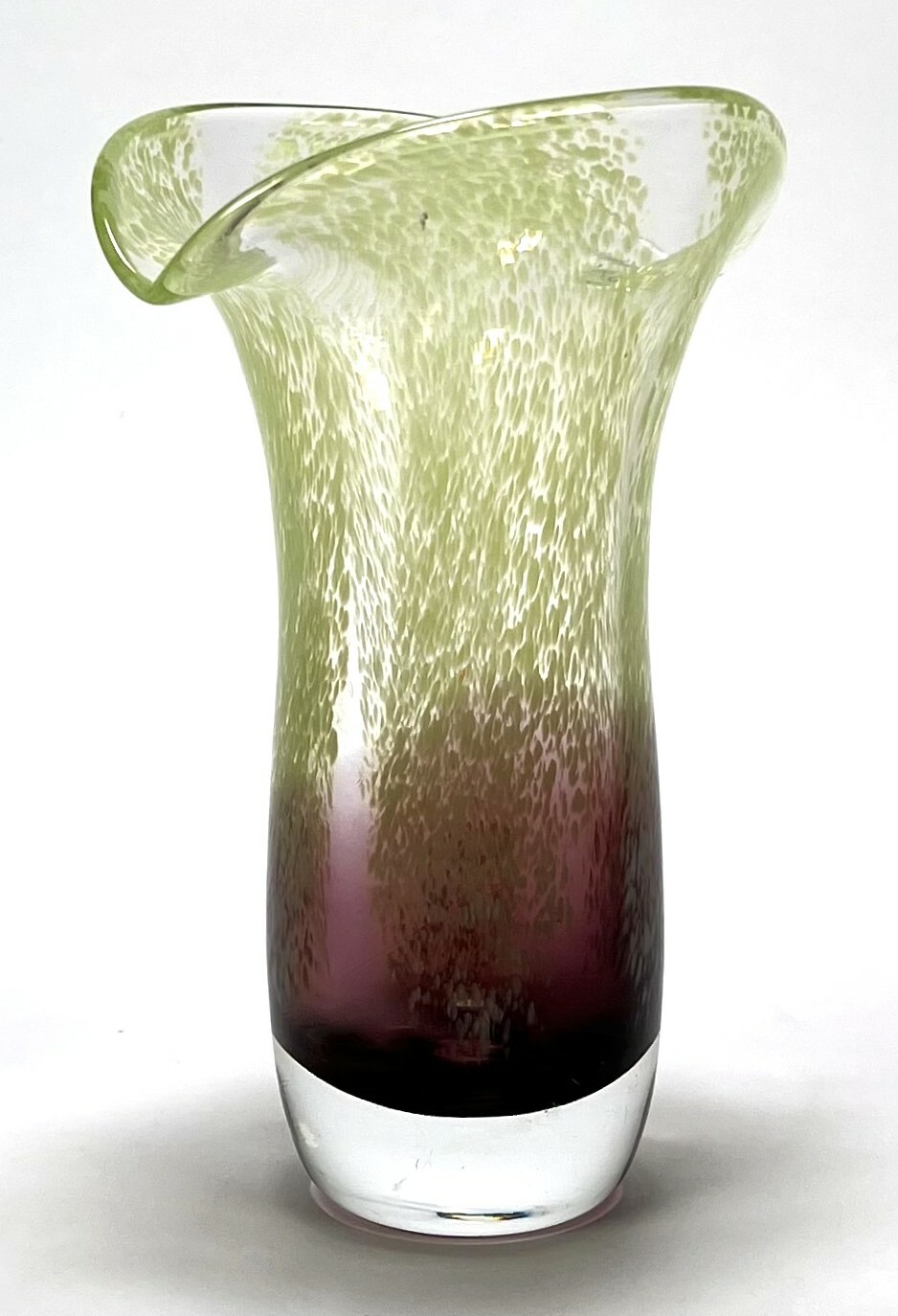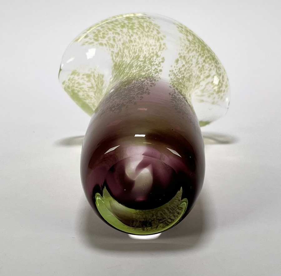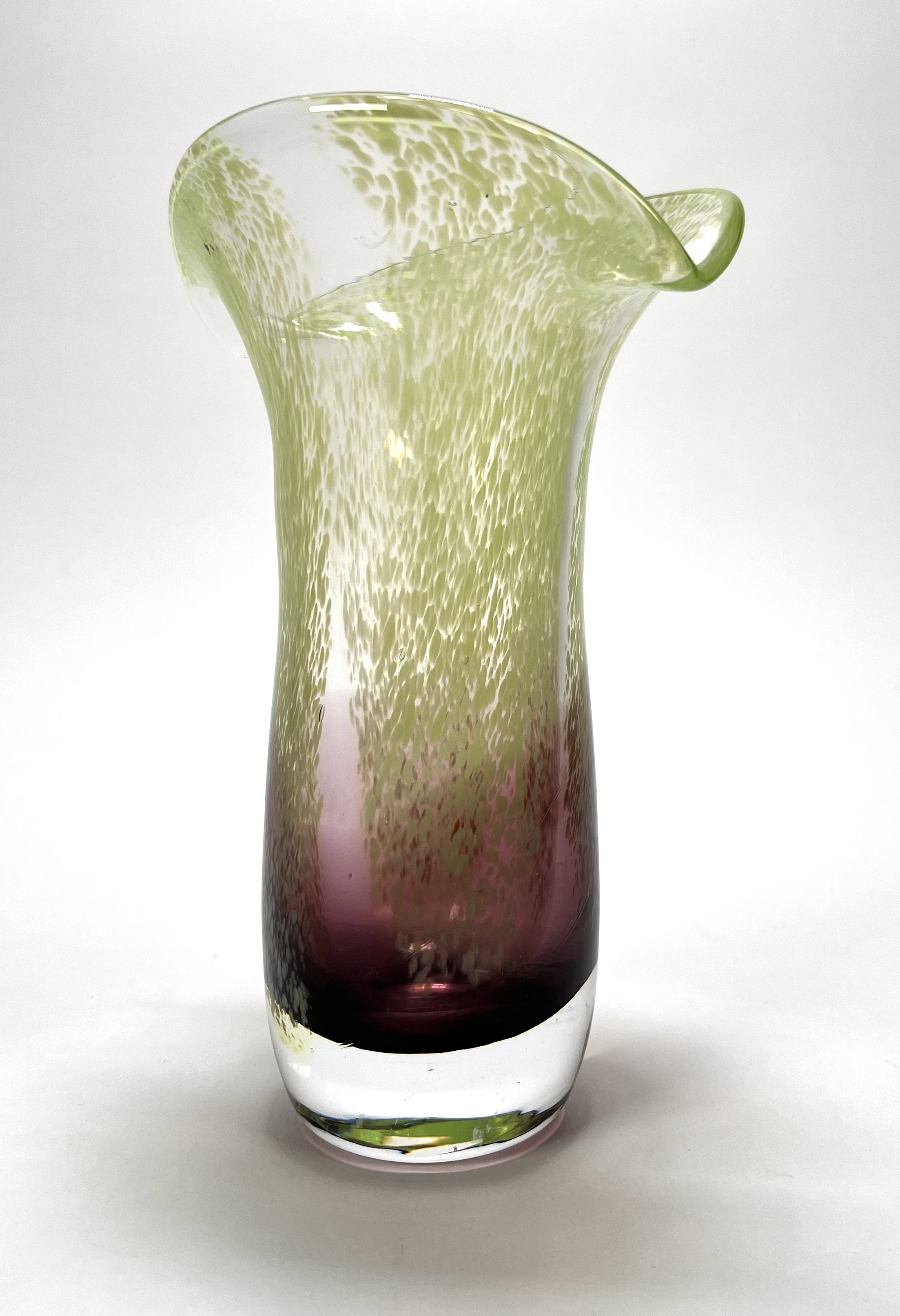 Vaas uit de Mid-century modern periode, vervaardigd uit mond geblazen glas met een karakteristiek kleurverloop van diep amethist naar limegroen. De bovenzijde toont een dicht fritdecor van witte en groene glasinsluitingen, uitlopend in een golvende, waaierachtige rand. Datering circa 1970, Europese herkomst. Klaar om te bieden? Registreer je nu en doe mee aan de veiling! |