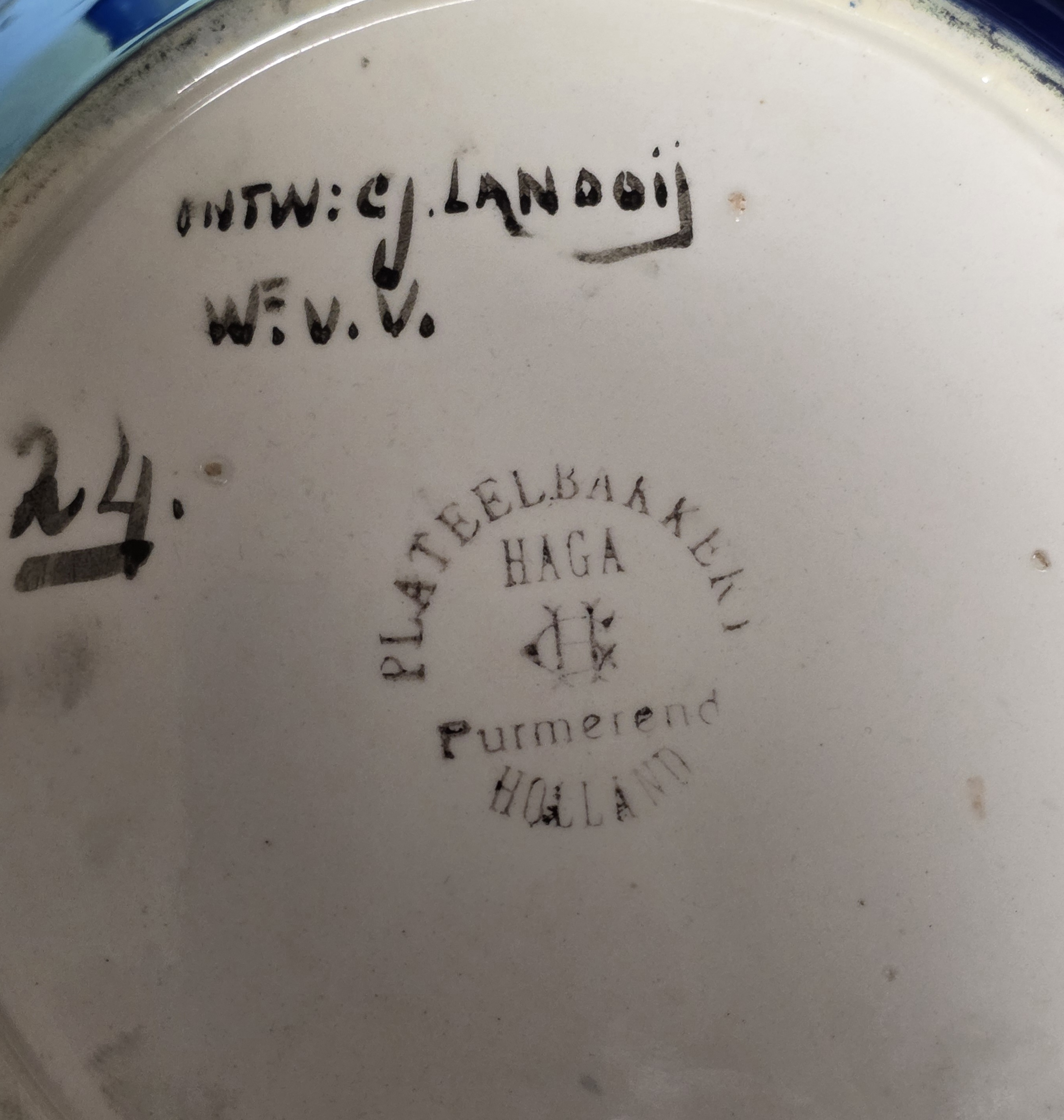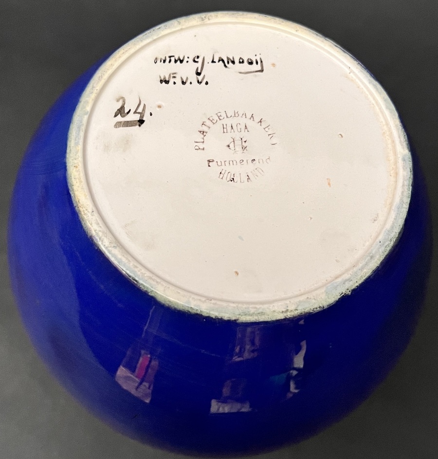 Vaas door Chris Lanooy (1881–1948), uitvoering aardewerkfabriek Haga te Purmerend, uit de Jugendstil periode. Vervaardigd uit aardewerk met een blauw lusterdecor op een beige fond. De vaas toont een specifieke decor van vlinders, uitgevoerd in een iriserende glazuurtechniek. De balustervormige corpus is aan de onderzijde gemerkt met de ontwerpersnaam en het fabrieksstempel uit Purmerend.