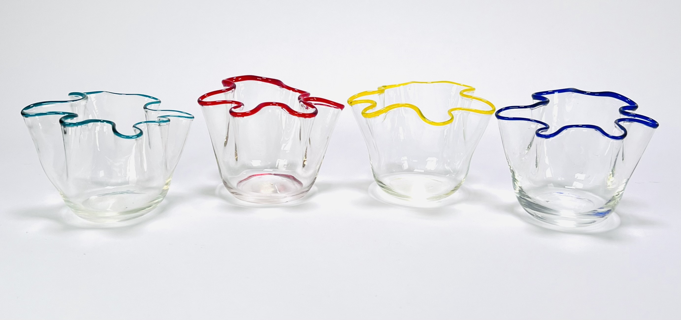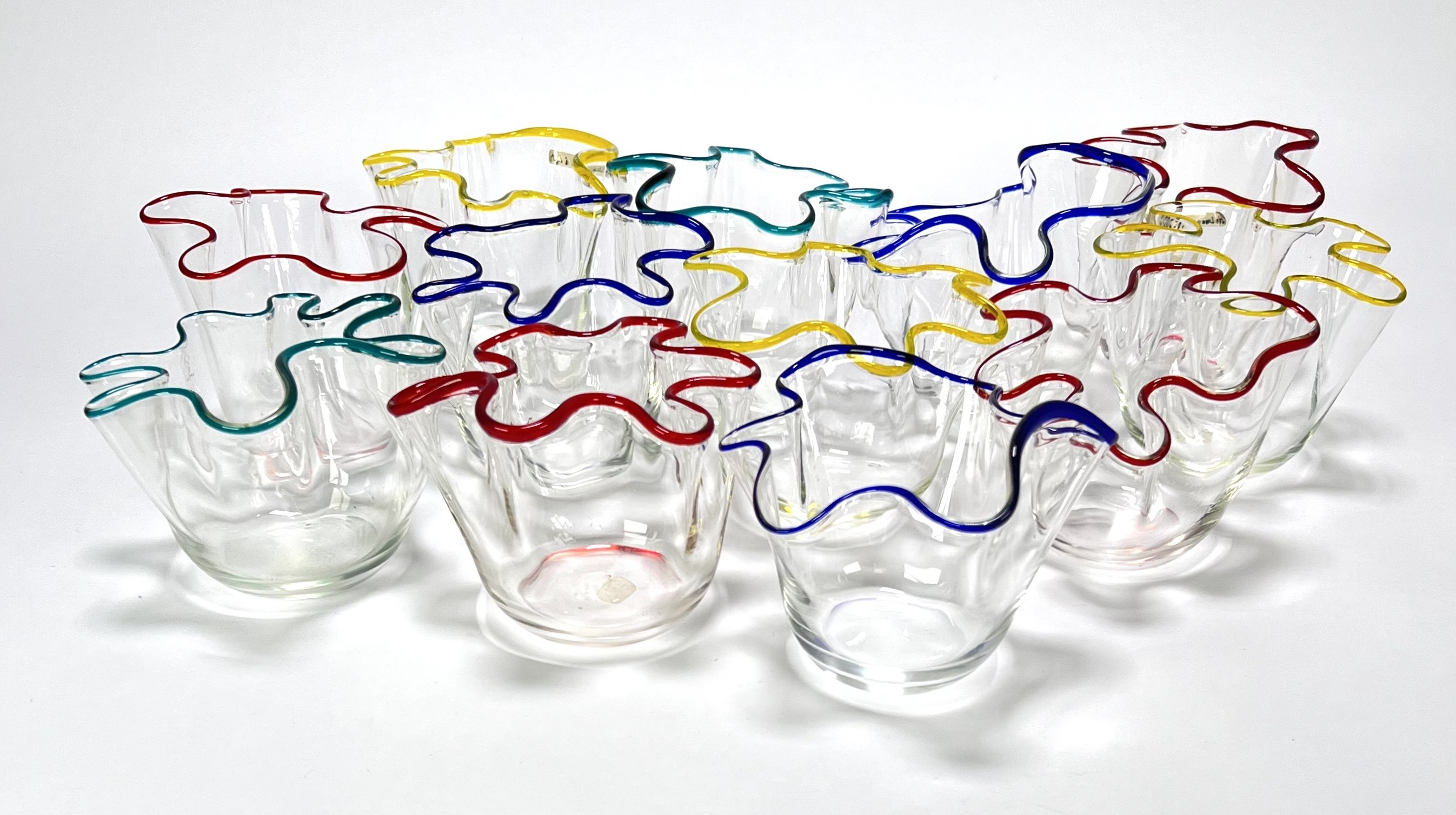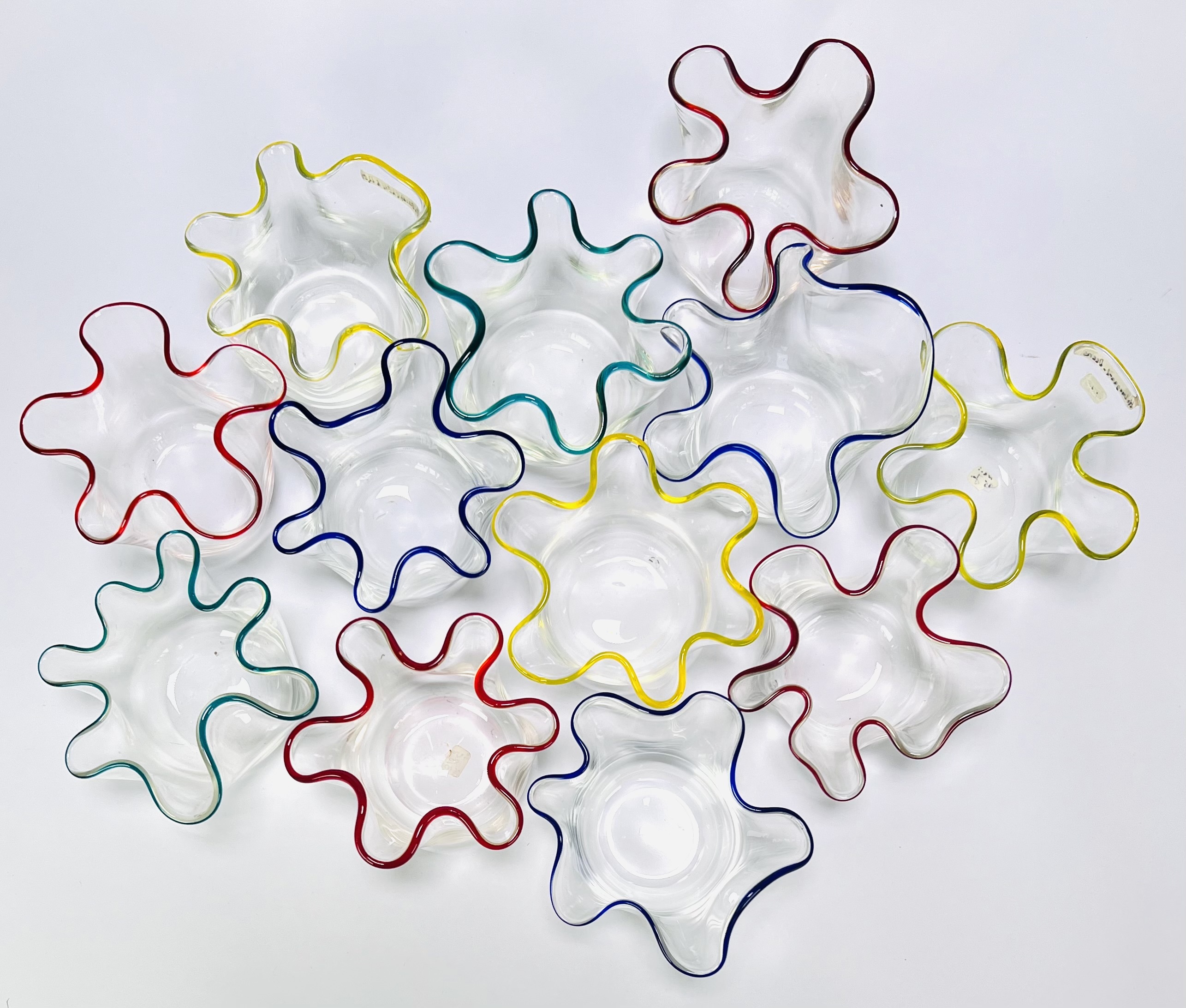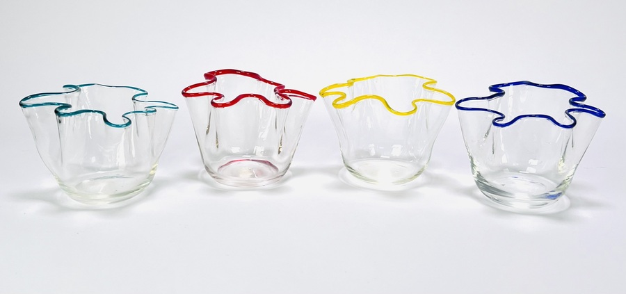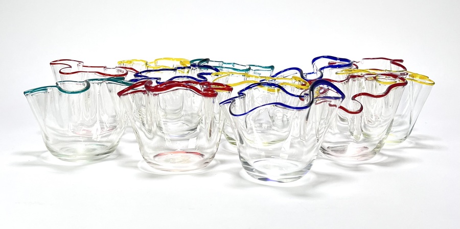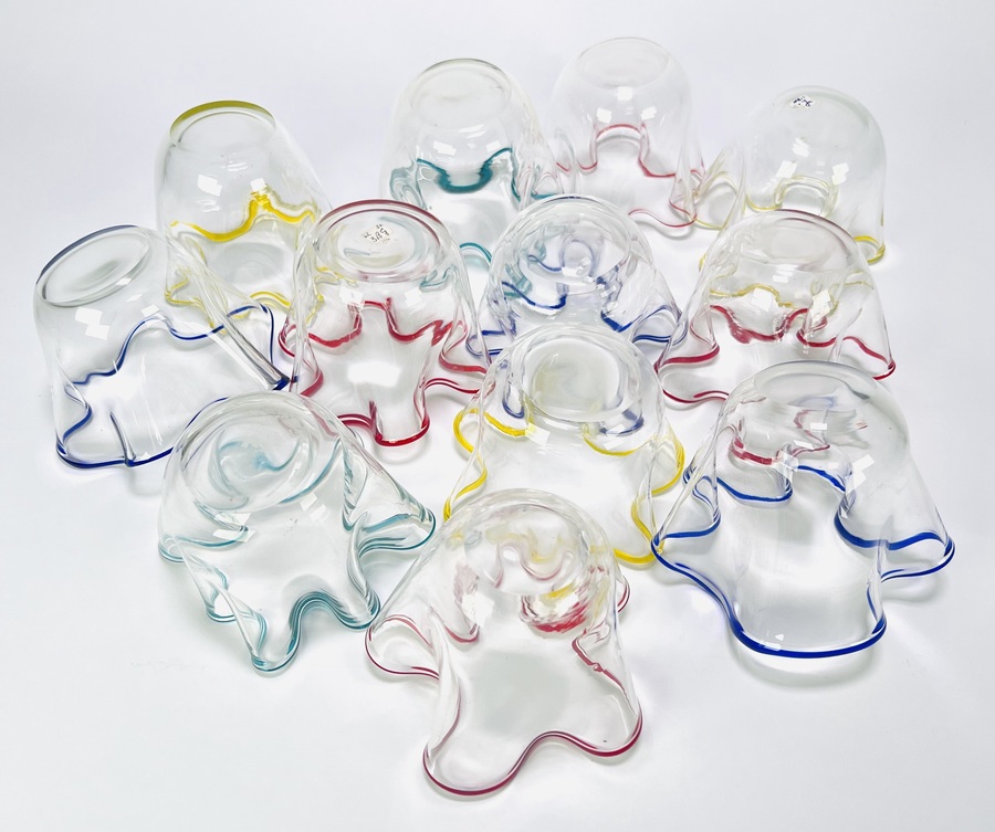 Vaasjes vervaardigd uit geblazen glas volgens het zogenoemde zakdoekmodel. De set bestaat uit twaalf vaasjes met vrij gevormde, golvende randen en transparante corpusdelen, afgewerkt met aangezette glasdraden in rood, blauw, geel en groen. Daterend 1950–1965. Kom langs tijdens de kijkdagen (10 t/m 12 april) en ontdek deze vaasjes zelf! |
