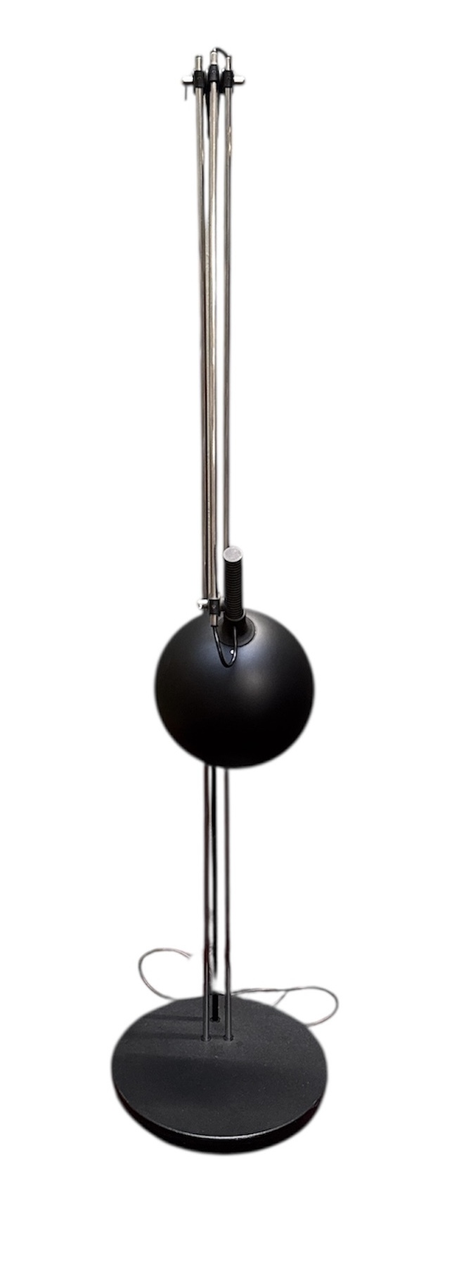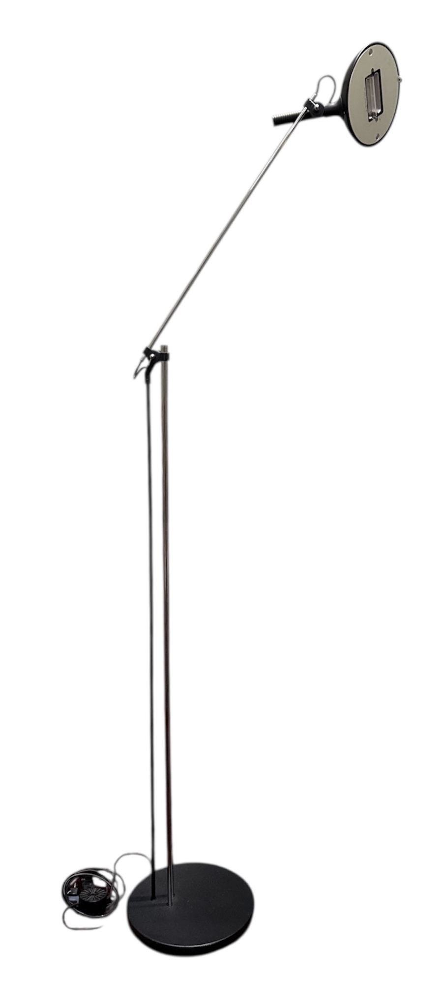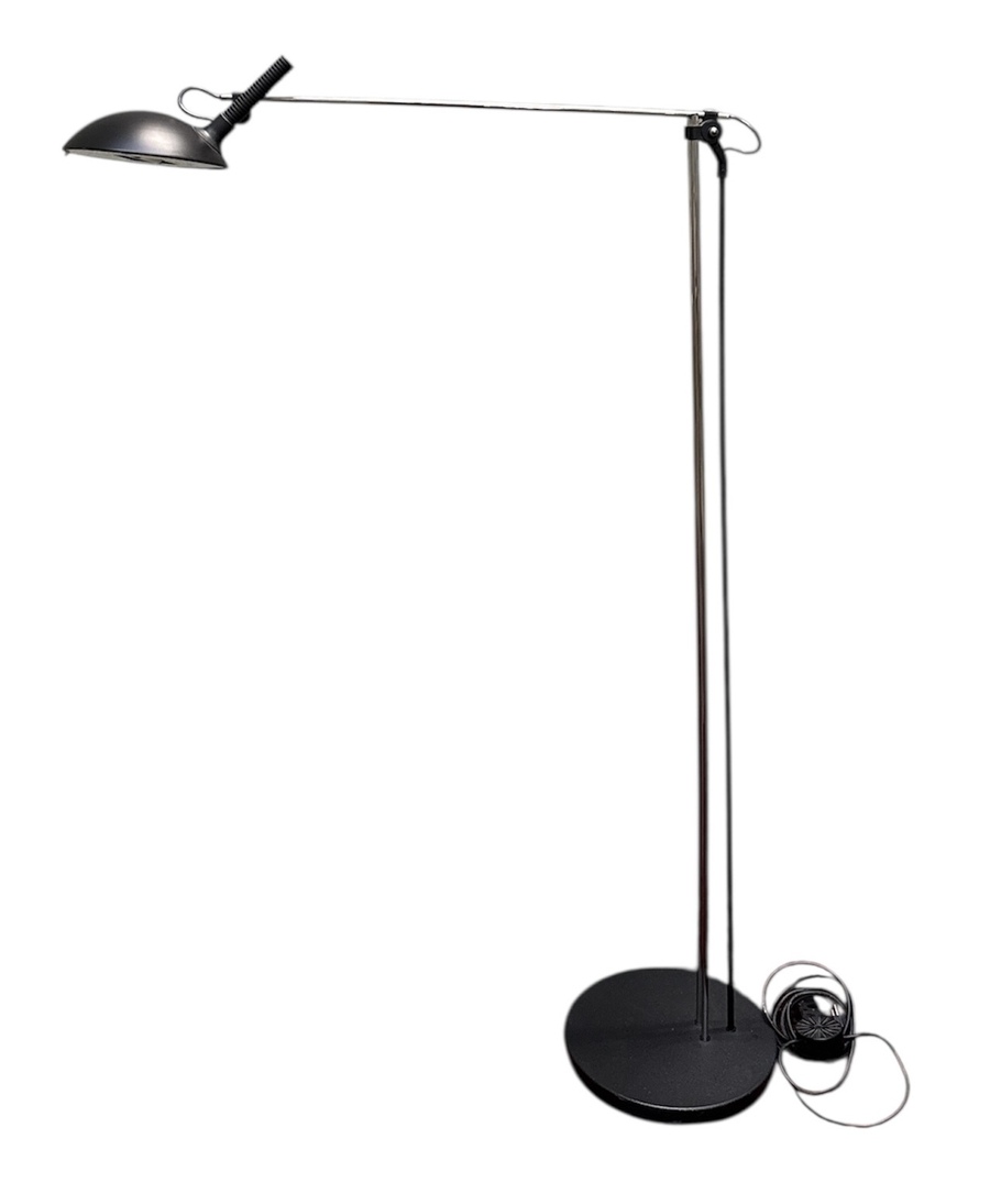 Vloerlamp in postmoderne stijl, vervaardigd uit gelakt metaal en glas. De constructie bestaat uit een ronde voetplaat met dubbele staanders en een verstelbare arm met scharnierend mechanisme. De ronde lampenkap bevat een halogeenlamp, daterend late 20e eeuw en een West-Europese herkomst. Registreer nu en bied eenvoudig online mee op deze vloerlamp! |