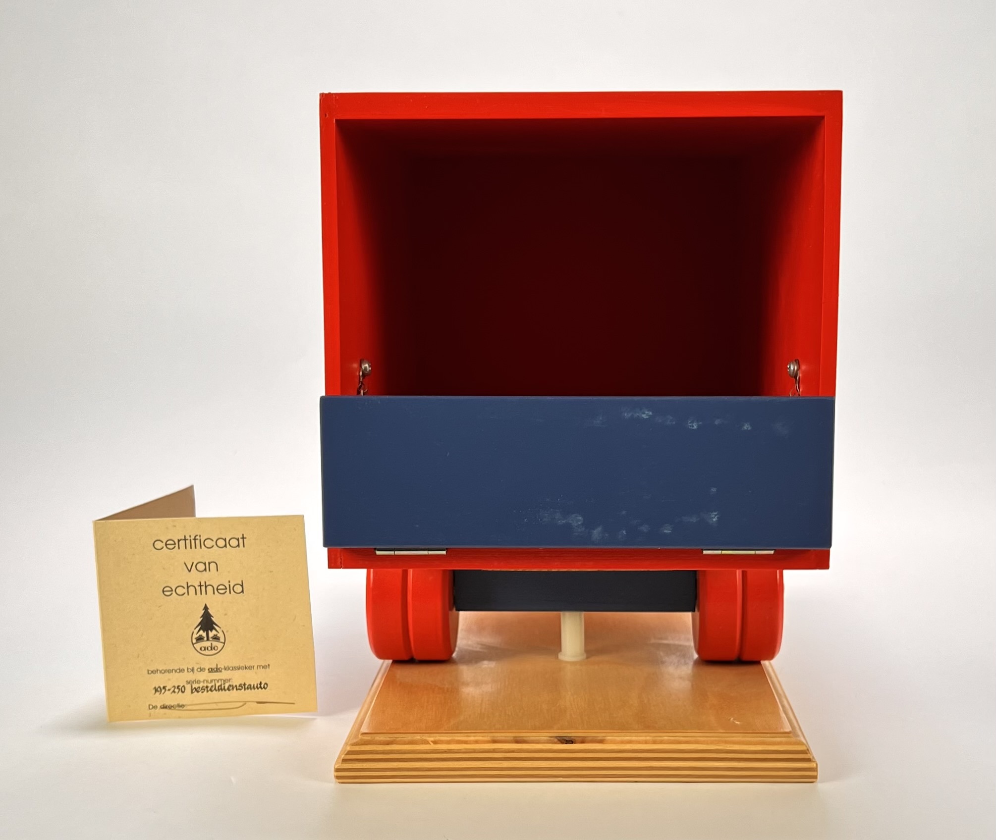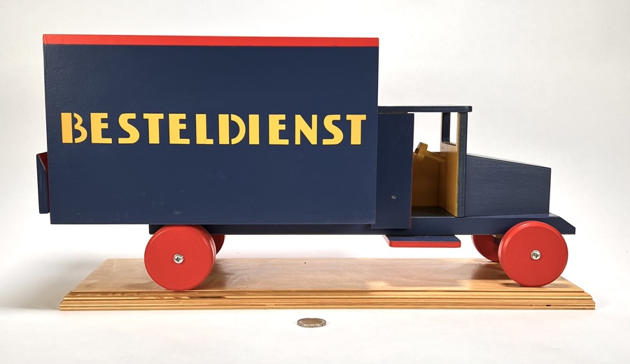 Bestelwagen van ADO (Arbeid door Onvolwaardigen) in de stijl van De Stijl, vervaardigd uit handbeschilderd hout. De bestelwagen heeft oplagenummer 195/250 en betreft een gelimiteerde replica van een origineel ontwerp uit de jaren dertig. Uitgevoerd in de karakteristieke primaire kleuren blauw, rood en geel met het opschrift Besteldienst. Voorzien van origineel certificaat en verpakking, vervaardigd in Zeist. Klaar om te bieden? Registreer je nu en doe mee aan de veiling! |