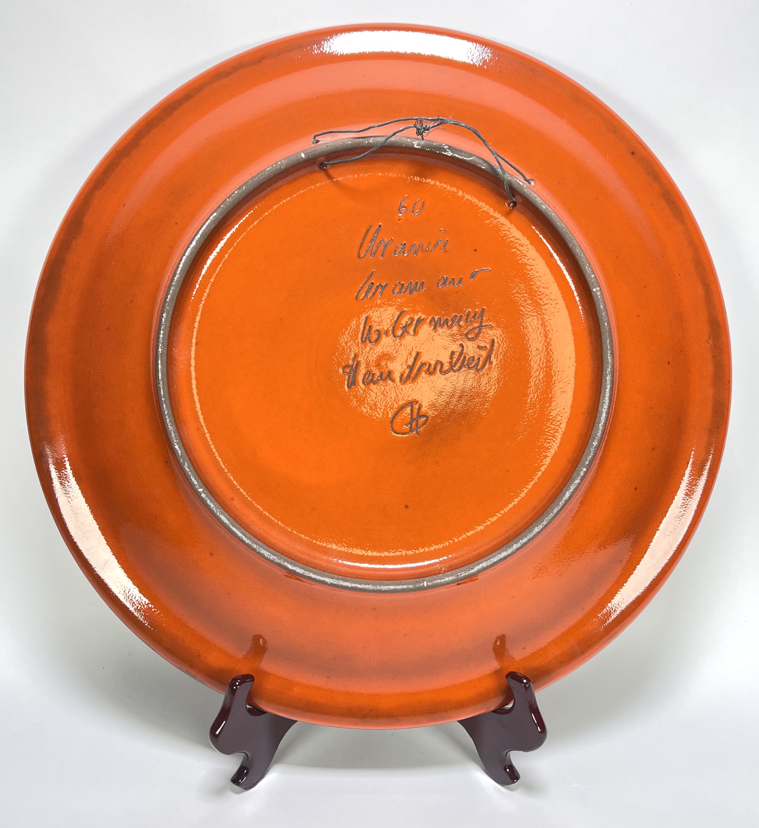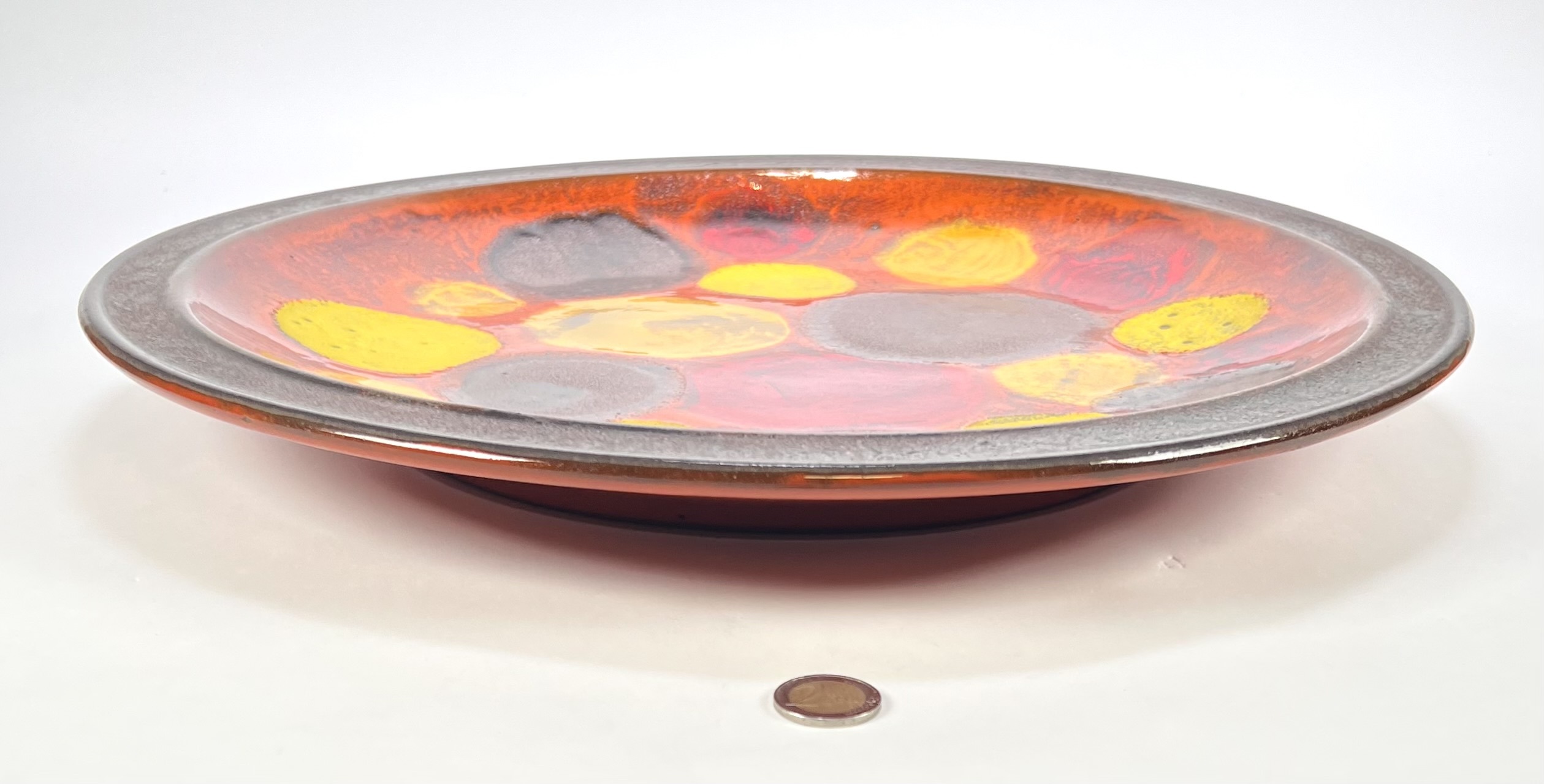 Wandbord van Urania Ceramano in Mid-century modern stijl, vervaardigd uit keramiek met handbeschilderd abstract decor. De voorstelling toont een dynamisch samenspel van gele, rode en grijze cirkels tegen een levendig oranje fond. Achterzijde gemerkt Urania Ceramano, daterend uit omstreeks 1965 en een West-Duitse herkomst. Het bord zelf beoordelen? Je bent welkom op onze kijkdagen op 10, 11 en 12 april. |