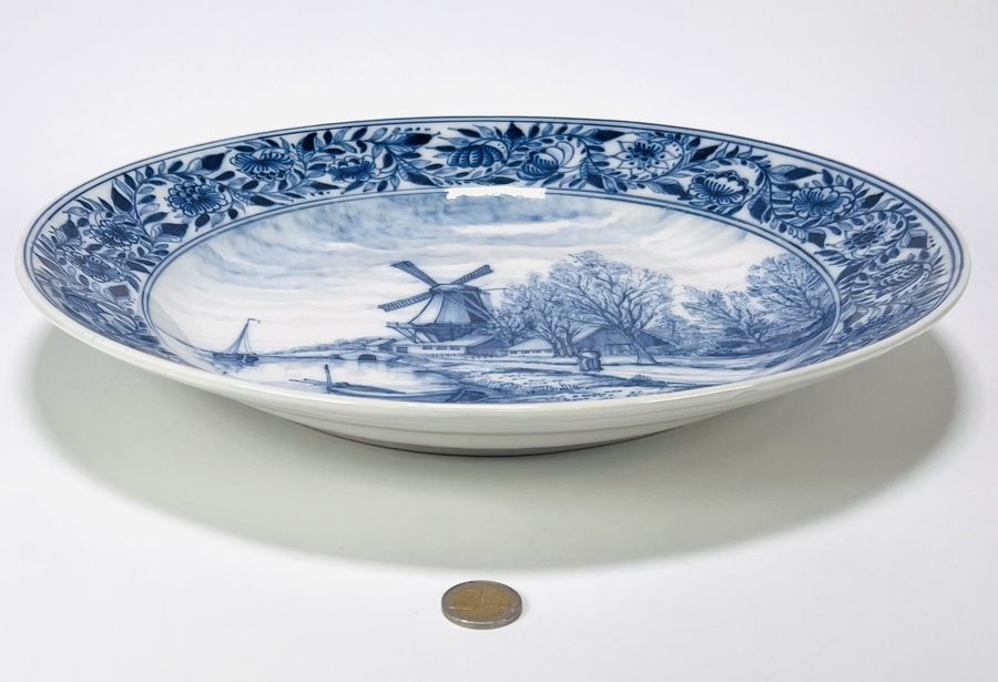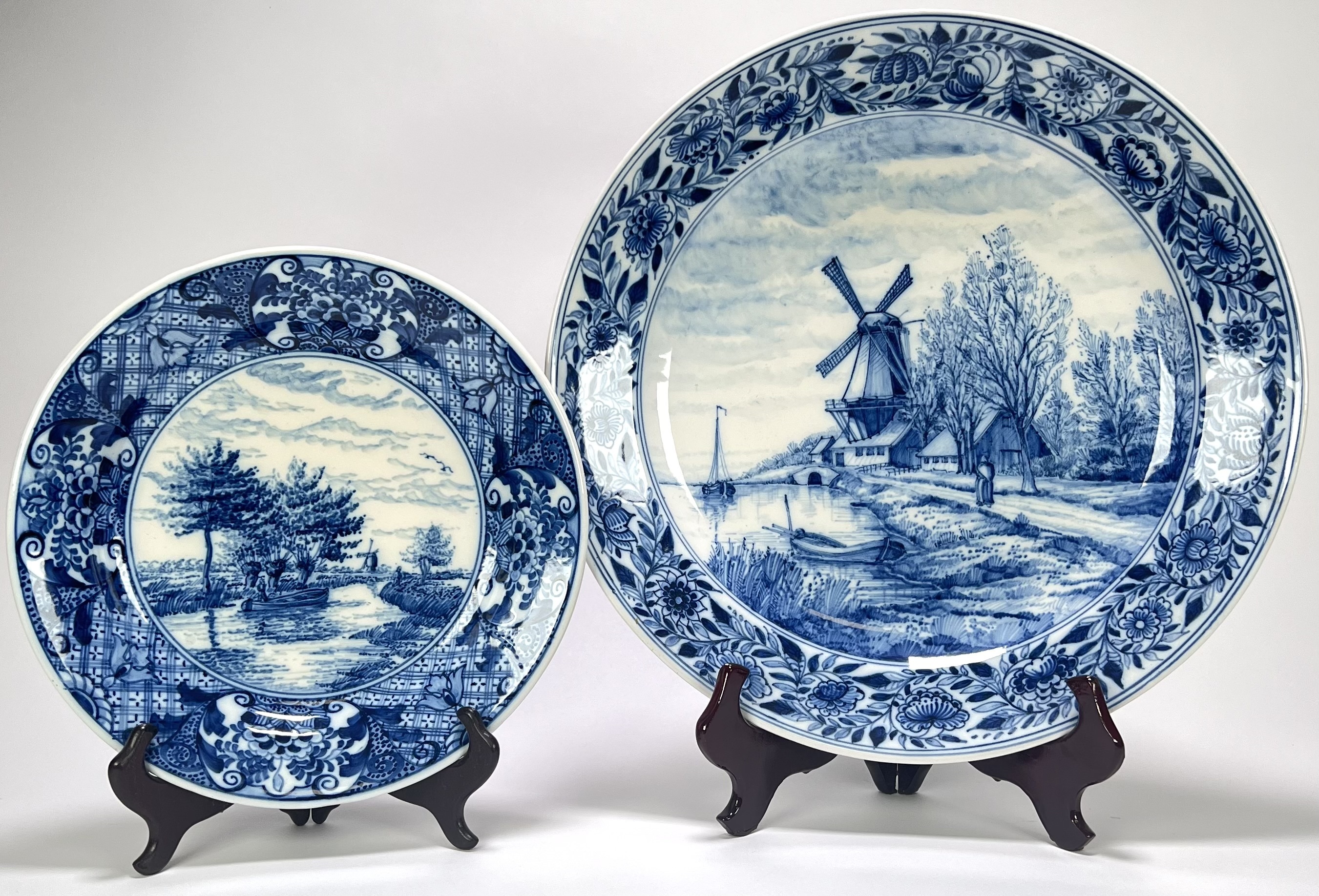 Wandborden van Koninklijke Tichelaar Makkum in traditionele Hollandse stijl, vervaardigd uit handbeschilderd plateel met tinglazuur. De voorstellingen tonen gedetailleerde polderlandschappen met molens en zeilboten in kobaltblauw op wit fond, met florale randdecoraties. Gemerkt aan de onderzijde met het schildmerk en modelnummers. De wandboren dateren uit de 20e eeuw en hebben een Nederlandse herkomst. Eerst deze wandborden zien voordat je biedt? Bezoek onze kijkdagen op 10, 11 en 12 april! |