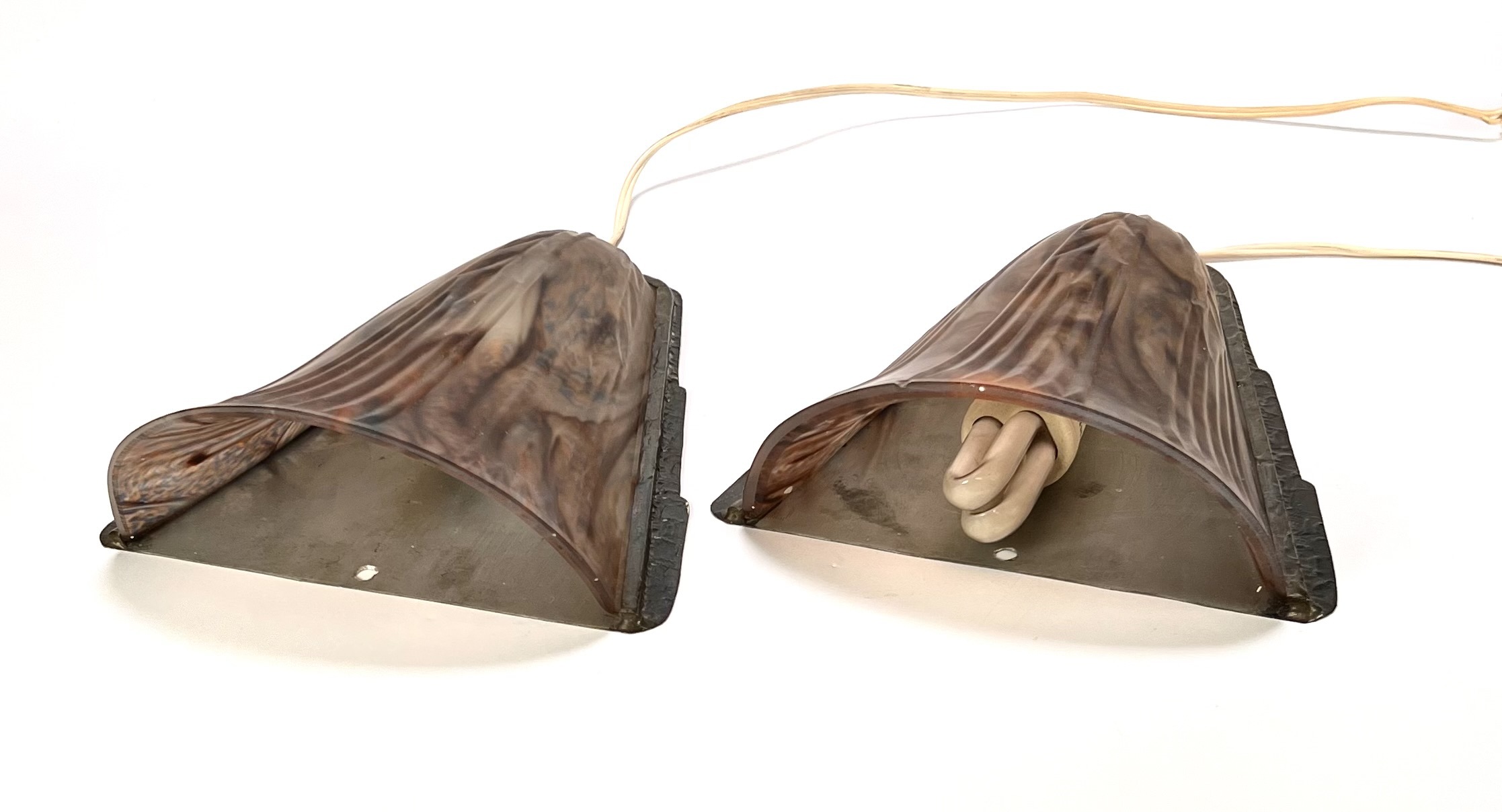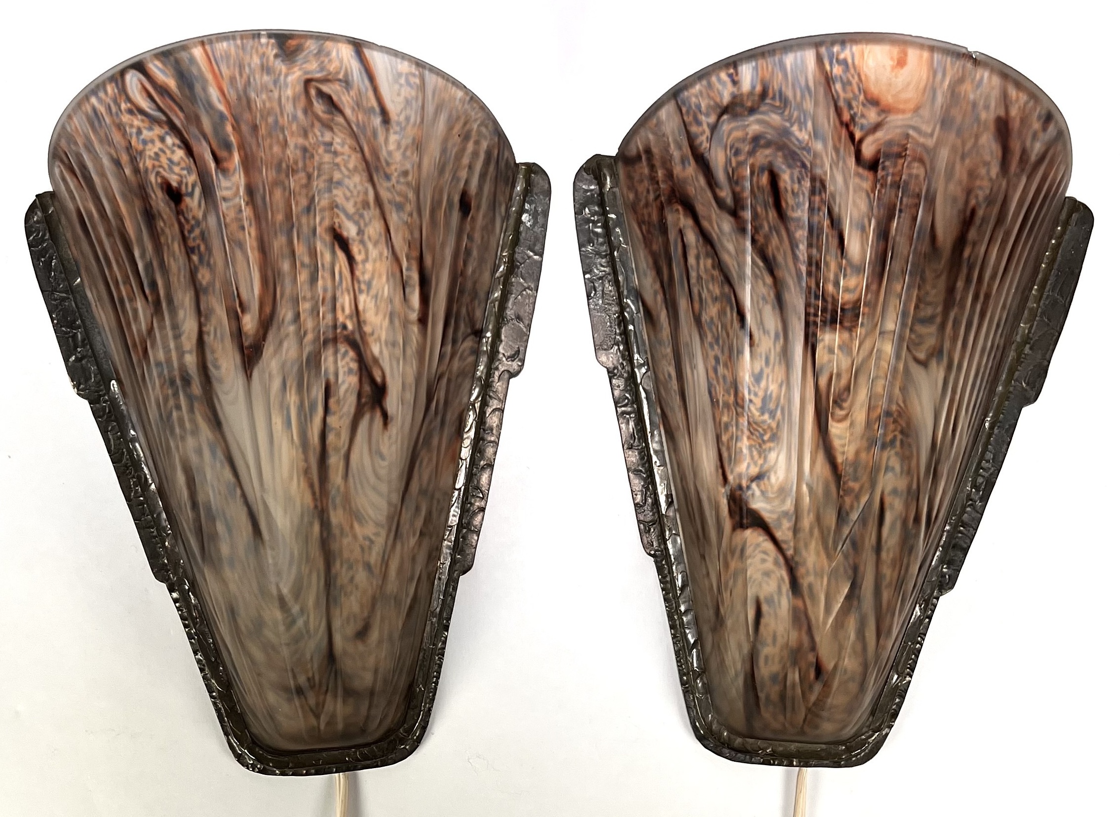 Art Deco wandlampen, vervaardigd uit gemarmerd persglas met metalen achterplaten. Het paar toont een waaiervormig kap met een verticaal geribbeld reliëf en een gewolkt pigmentdecor in bruine en paarse nuances. De kappen zijn gevat in een metalen montuur met gehamerde randen. Daterend uit circa 1930 en een Franse herkomst. Zeker zijn van deelname? Plaats vanaf 3 april een schriftelijk bod online! |
