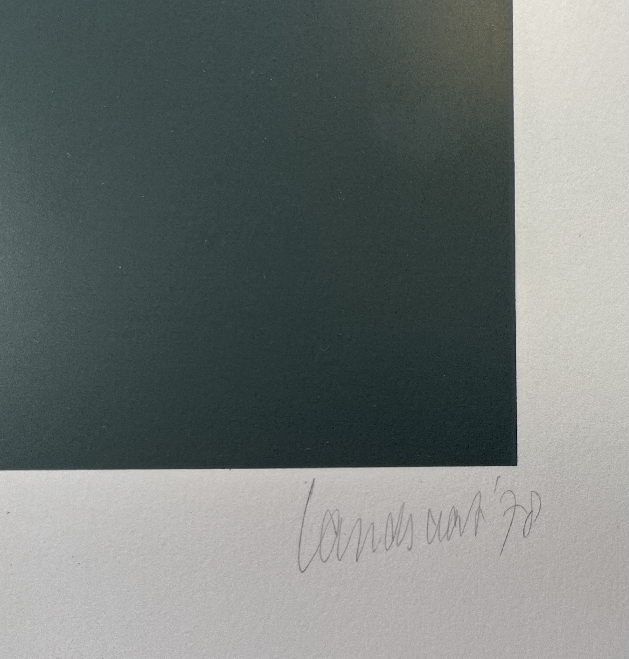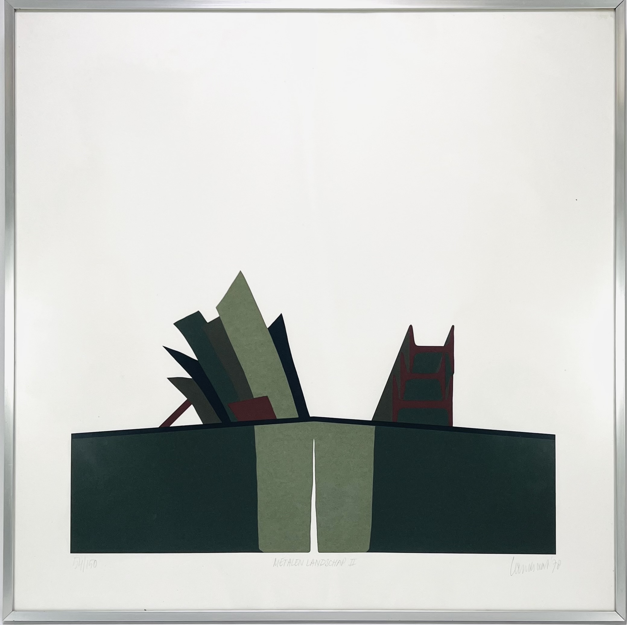 Zeefdruk door Hans Landsaat (1935) toont een abstract geometrische compositie getiteld "Metalen Landschap II" in modernistische stijl, uitgevoerd in zeefdruk op papier. Het werk kenmerkt zich door strakke kleurvlakken in donkergroen, grijsgroen en dieprood. Gesigneerd en gedateerd '70 rechtsonder, genummerd 54/150 linksonder en een Nederlandse herkomst. Registreer nu en bied eenvoudig online mee op deze zeefdruk! |
