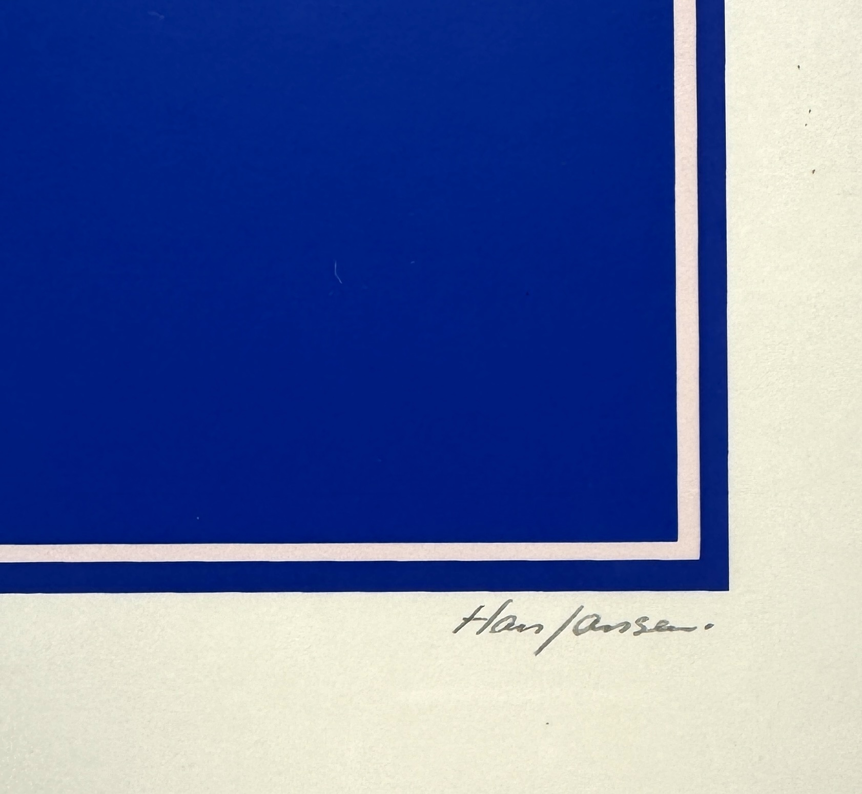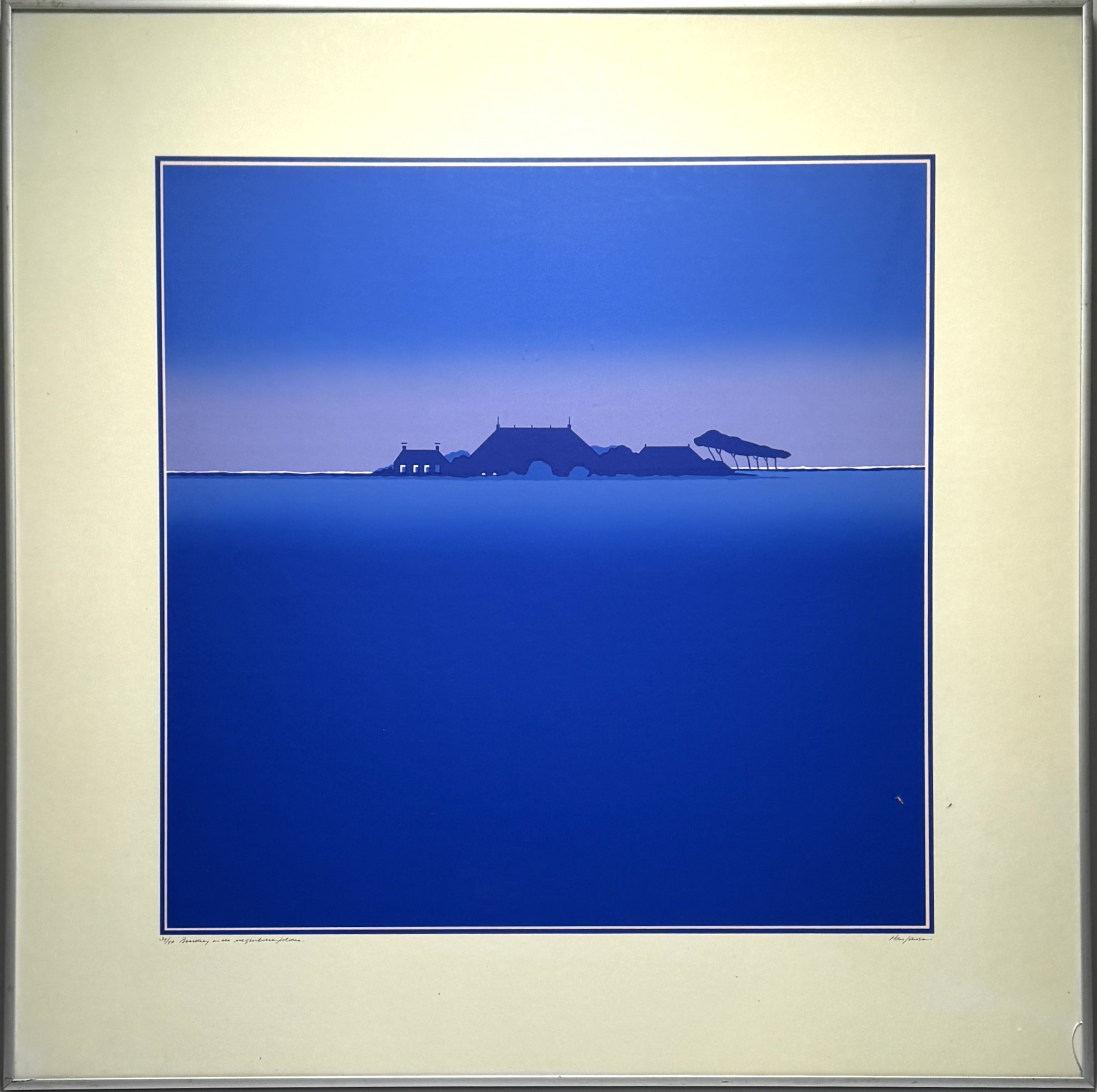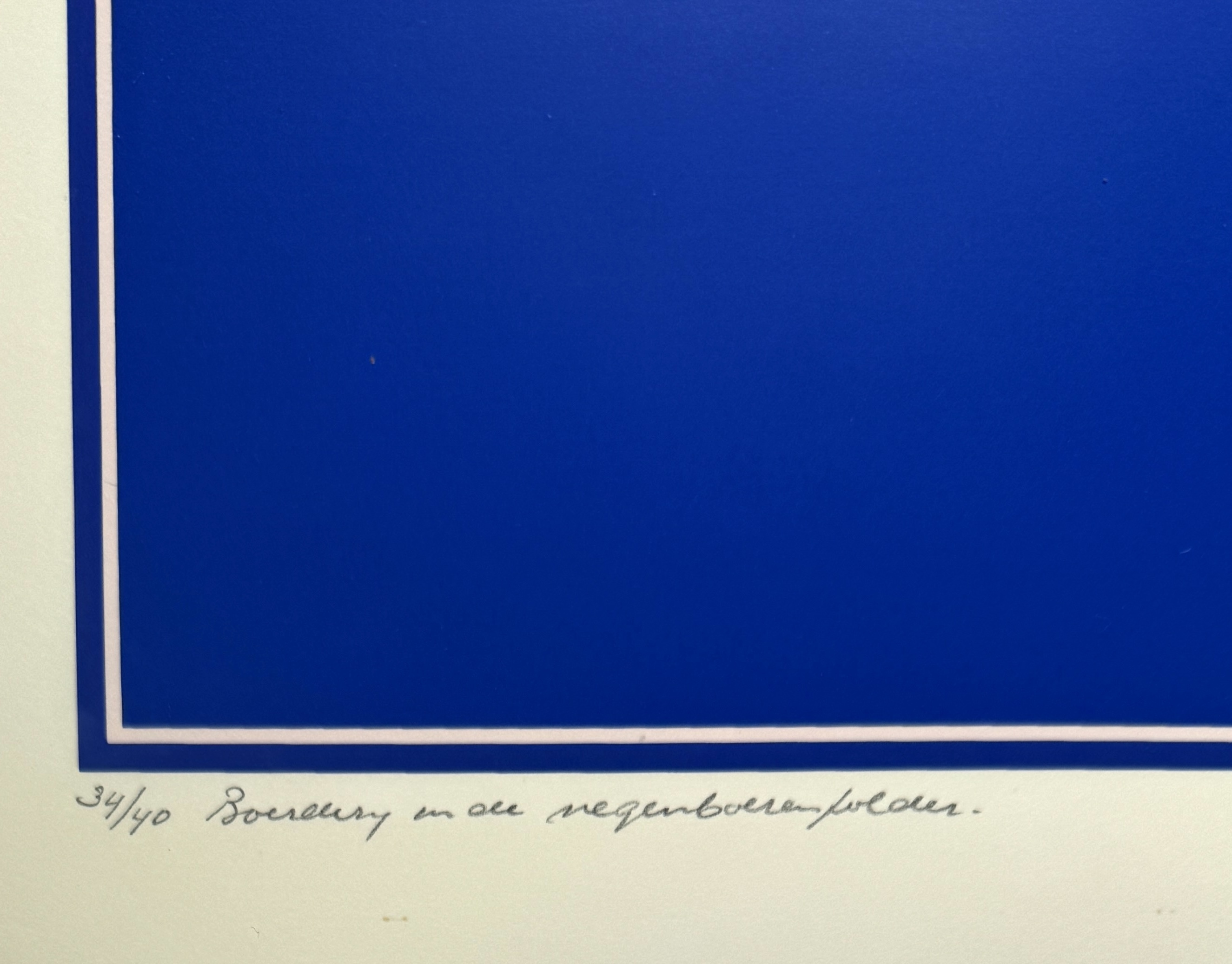 Zeefdruk door Han Jansen (1931–1994) getiteld “Boerderij in de Negenboerenpolder” in modernistische stijl, meerkleurige zeefdruktechniek op papier. Linksonder genummerd 34/40 en getiteld, rechtsonder gesigneerd. De compositie wordt bepaald door een lage horizon met donker silhouet van boerderij en bomen tegen een egaal ultramarijn kleurveld met subtiele lichtverloop. Deze zeefdruk dateert uit de tweede helft van de 20e eeuw en heeft een Nederlandse herkomst. Deze zeefdruk zelf beoordelen? Je bent welkom op onze kijkdagen op 10, 11 en 12 april! |