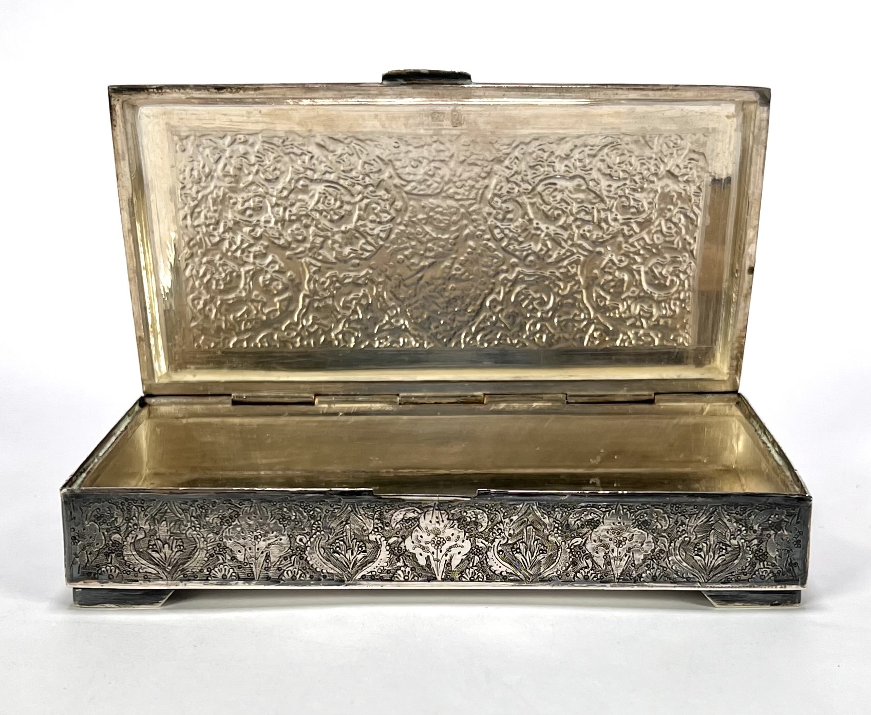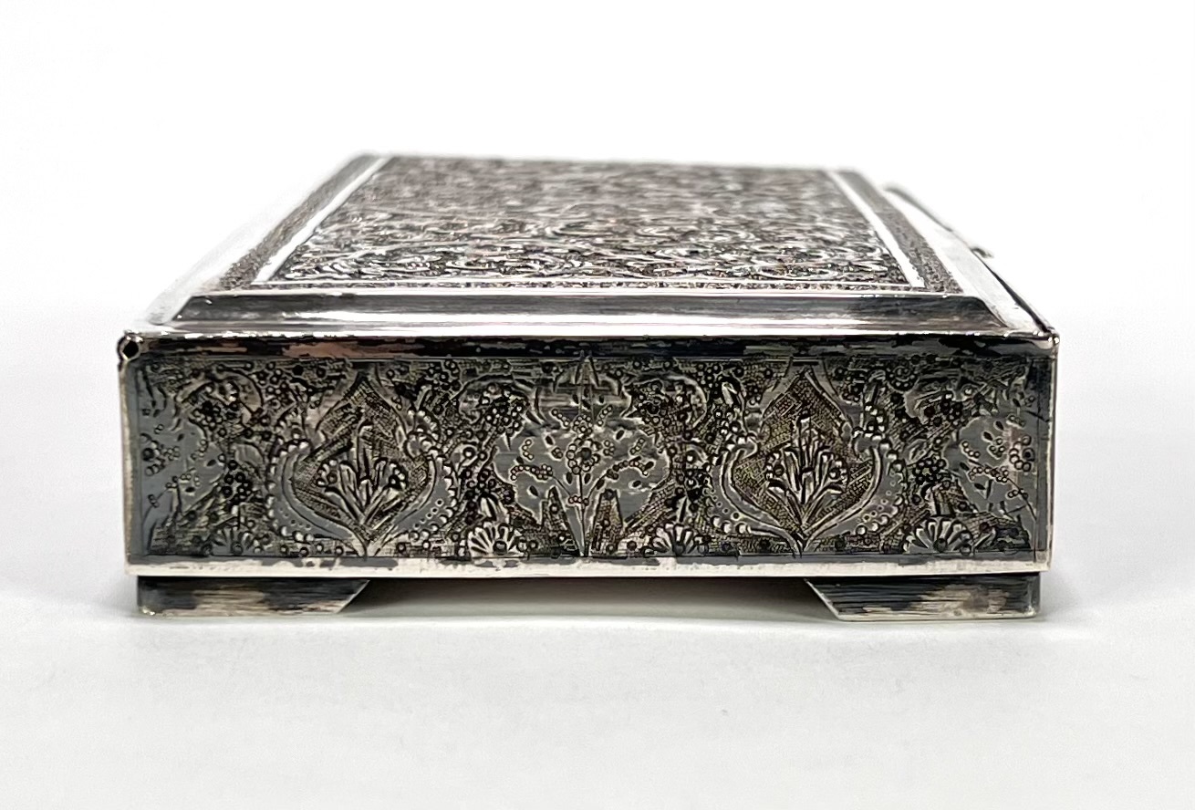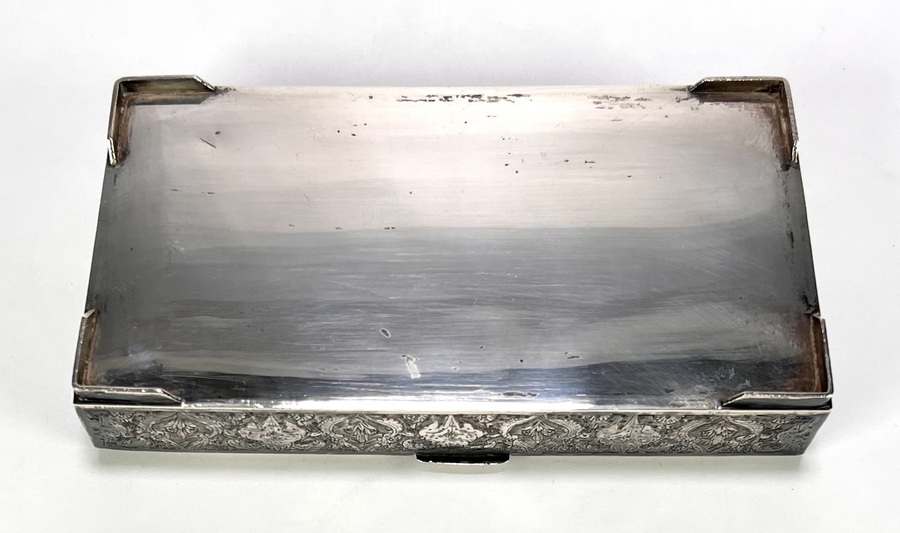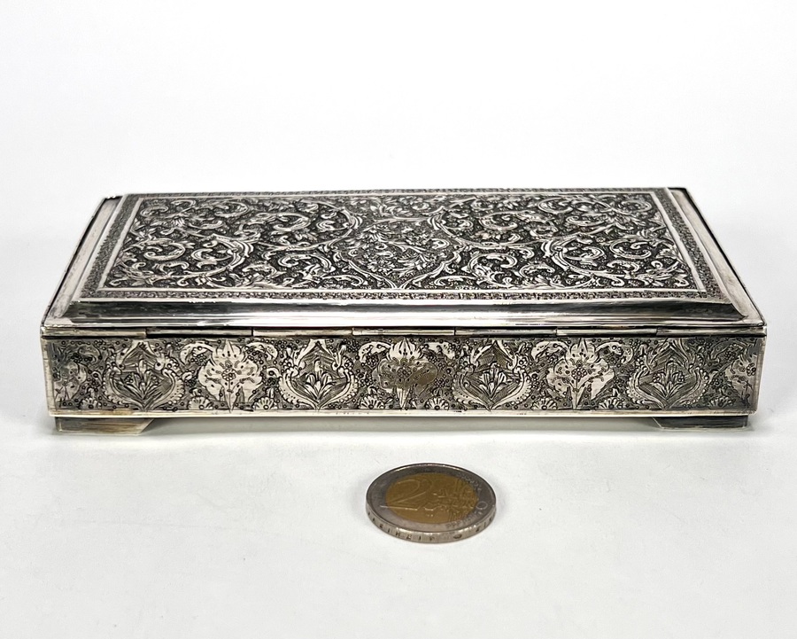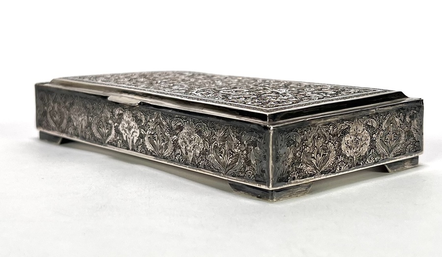 Dekseldoosje uit de Isfahan-traditie, circa 1930–1950, vervaardigd uit Perzisch zilver. Het rechthoekige dekseldoosje toont een rijke, handmatig geciseleerde decoratie met bloempatronen. De binnenzijde van het deksel vertoont de gedreven reliëfafdruk van het externe graveerwerk. Voorzien van Perzische zilvermerken op de rand: een gehaltestempel en meesterteken. Het zilverwerk weerspiegelt de klassieke Iraanse Ghalamzani-techniek. Klaar om te bieden? Registreer je nu en doe mee aan de veiling! |