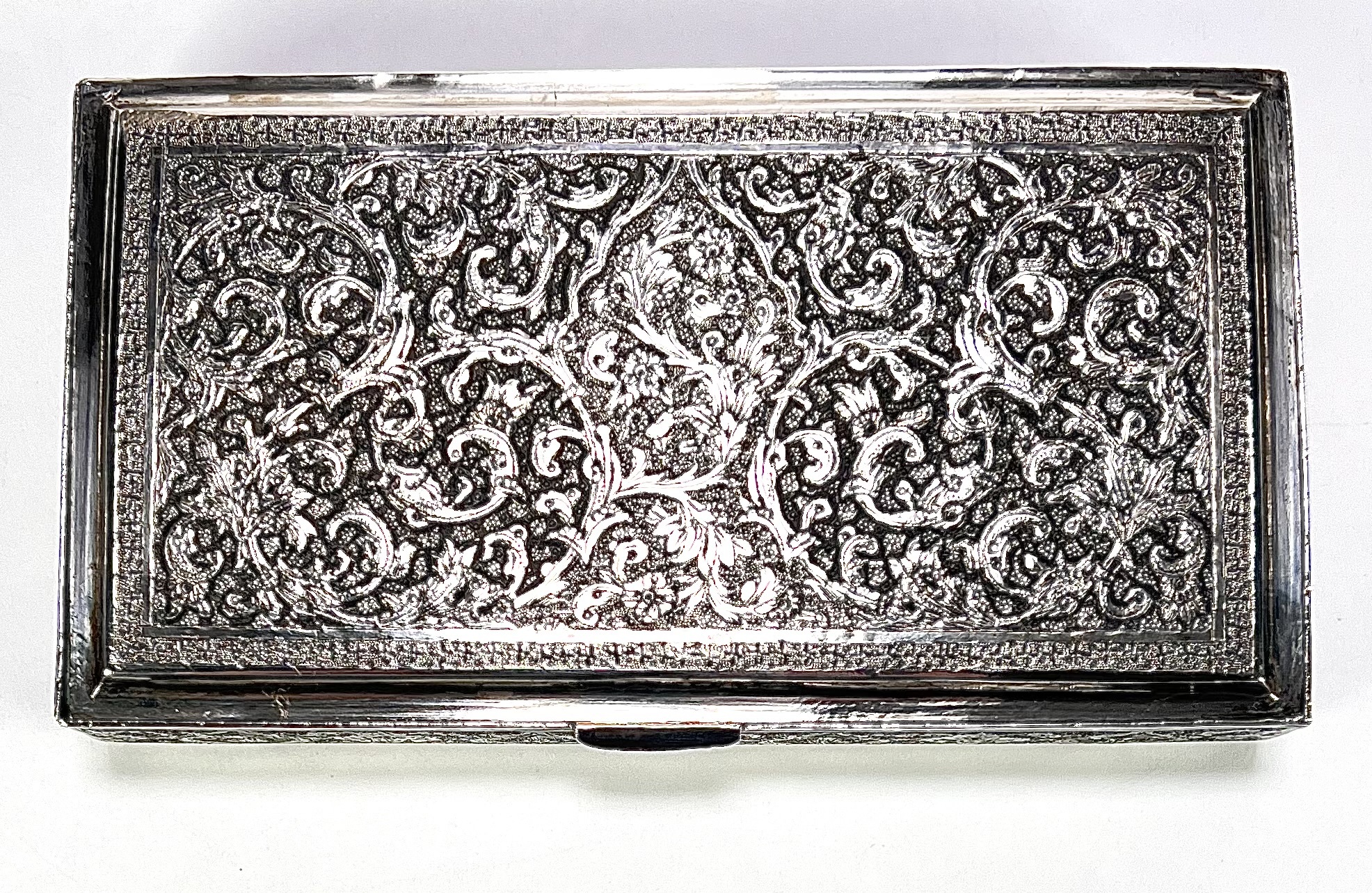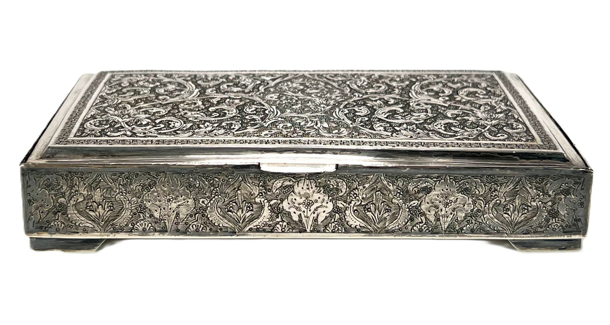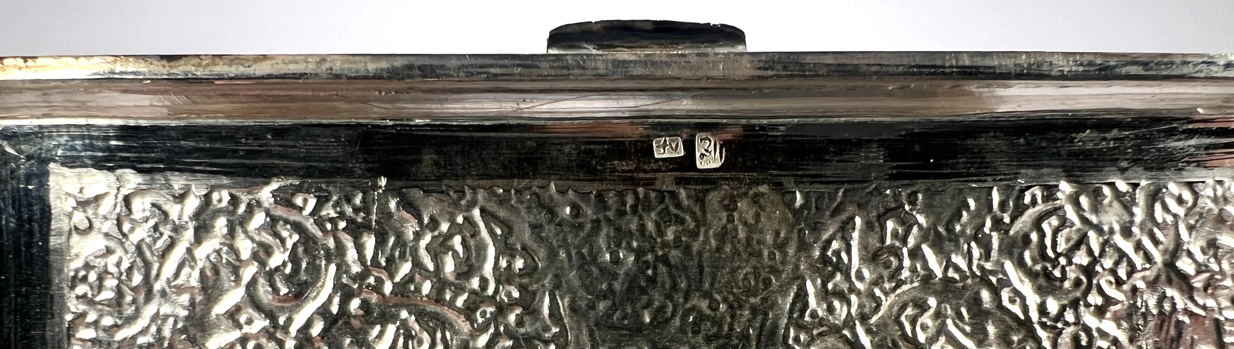 Dekseldoosje uit de Isfahan-traditie, circa 1930–1950, vervaardigd uit Perzisch zilver. Het rechthoekige dekseldoosje toont een rijke, handmatig geciseleerde decoratie met bloempatronen. De binnenzijde van het deksel vertoont de gedreven reliëfafdruk van het externe graveerwerk. Voorzien van Perzische zilvermerken op de rand: een gehaltestempel en meesterteken. Het zilverwerk weerspiegelt de klassieke Iraanse Ghalamzani-techniek. Klaar om te bieden? Registreer je nu en doe mee aan de veiling! |