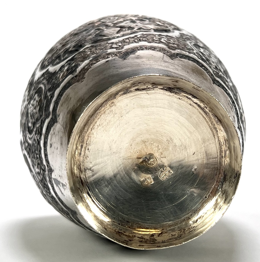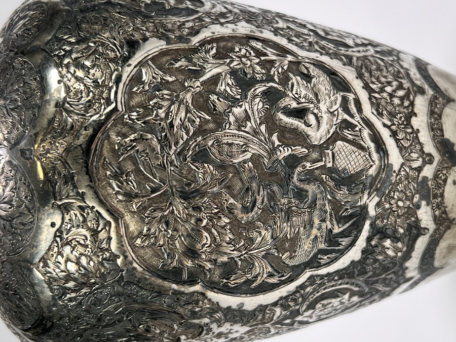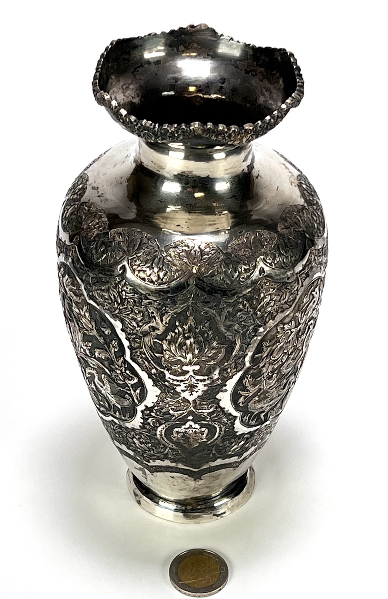 Perzische zilveren vaas uit de vroege twintigste eeuw, circa 1930, vervaardigd uit zilver. De balustervormige vaas toont een gedreven decoratie van vogels en bloemen, uitgevoerd in fijn geciseleerd reliëf. De vaas heeft een geschulpte rand. De onderzijde is voorzien van Perzische zilvermerken, herkomst Iran. Jouw kans op deze vaas begint met registreren – bied live of online mee! |