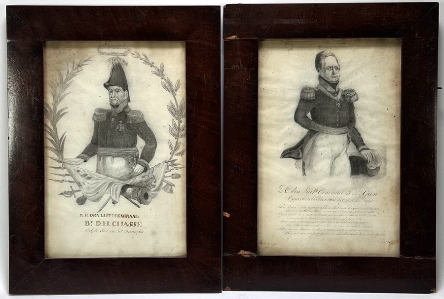 Litho's van militaire portretten in neoclassicistische stijl. De prenten tonen Baron D.H. Chassé en Generaal J. van Geen in uniform, gecompleteerd met militaire trofeeën en een patriottisch gedicht gedateerd 1831 te Bath. De litho's dateren uit 1831 en hebben een Nederlandse herkomst.