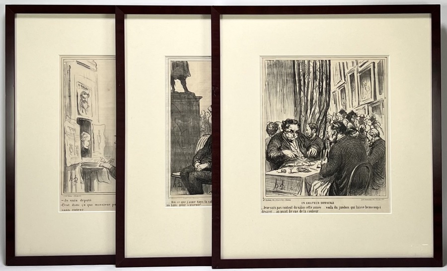 Litho's door Honoré Daumier (1808–1879) tonen satirische scènes uit het Parijse leven, uitgevoerd in lithografie op papier. De set bevat authentieke uitgaven uit 'Le Charivari', waarbij de typografie op de achterzijde doorschemert. De werken, zoals 'Un Amateur Difficile', tonen Daumiers maatschappijkritiek. De litho's dateren uit circa 1852 en hebben een Franse herkomst.