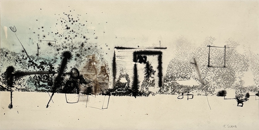 Gemengde techniek door France Slana (1926–2022) toont een abstracte compositie met gestippelde texturen, inktvlekken en lineaire tekens, uitgevoerd in gemengde techniek op papier. De horizontale opbouw wordt onderbroken door architectonisch aandoende vormen en vrije gebaren. Rechtsonder gesigneerd, het werk dateert uit de tweede helft van de 20e eeuw en heeft een Sloveense herkomst.