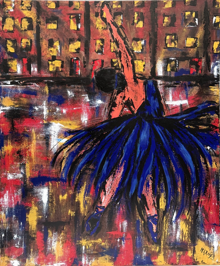 Schilderij door M. Kraijer toont een dansende figuur tegen een stedelijke achtergrond in expressionistische stijl, uitgevoerd in acrylverf op doek. Met krachtige penseelstreken en contrasterende kleurvlakken in rood, geel, blauw en zwart. Rechtsonder gesigneerd en gedateerd 2013, het werk heeft een Nederlandse herkomst.