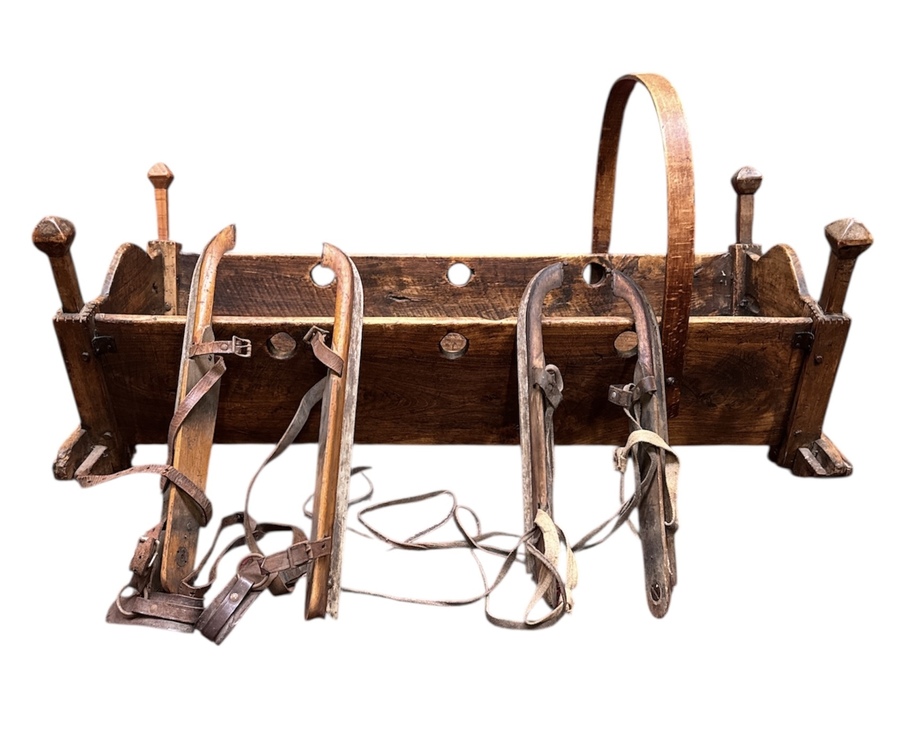 Een houten schommelwieg en twee paar Friese doorlopers, vervaardigd uit hout met ijzer en leren bindingen. De schommelwieg heeft een rechthoekige bakvorm op gebogen sledeprofiel met draagbeugel en is gemerkt “B. Lantinga Warga”. De doorlopers hebben houten schaatsbladen met leren riemen en metalen glijvlakken. De schommelwieg en schaatsen dateren uit de 19e eeuw, Friese herkomst.
