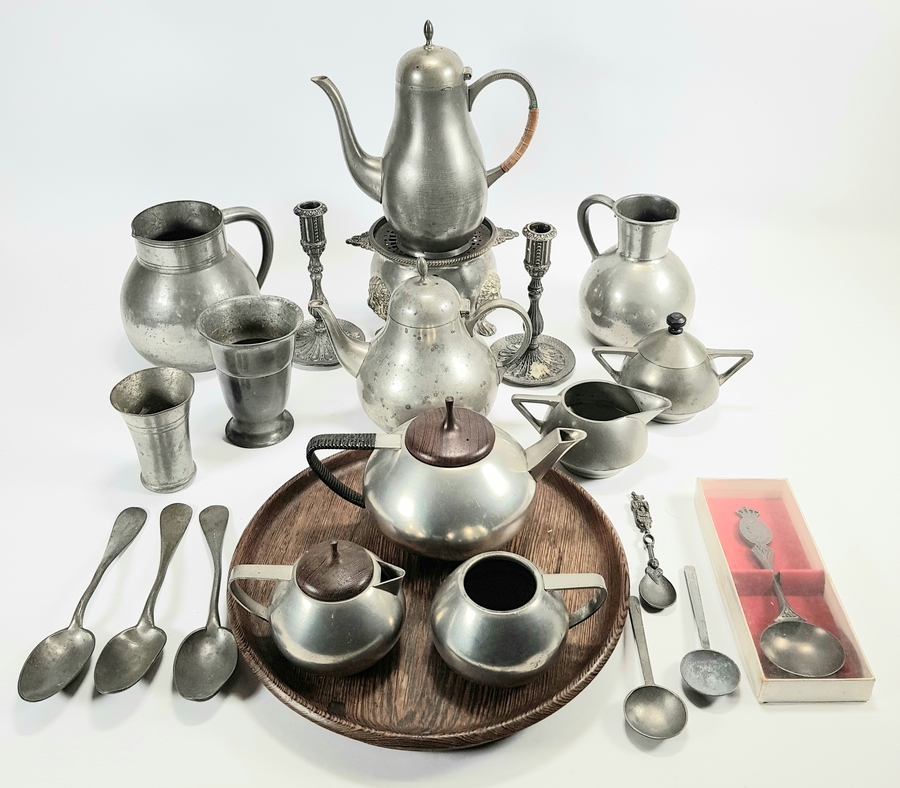 Lot tin in traditionele en modernistische stijl, vervaardigd uit gegoten en gedraaid metaal. De verzameling omvat koffiekannen met rieten grepen, kandelaars, bekers en een modernistische theeset op een houten dienblad.. De voorwerpen dateren uit de 19e/20e eeuw, Europese herkomst.