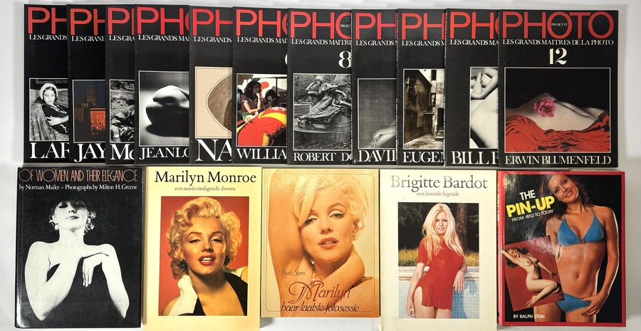 Lot boeken en tijdschriften in modernistische fotografiestijl, samengesteld uit uitgaven rond mode-, portret- en kunstfotografie. Onder meer Photo présente "Les Grands Maîtres de la Photo", albums 1 t/m 12 met ontbrekend deel 7, aangevuld met monografieën over Marilyn Monroe, Brigitte Bardot en pin-upfotografie. Het lot dateert uit de tweede helft van de 20e eeuw en heeft een internationale herkomst.