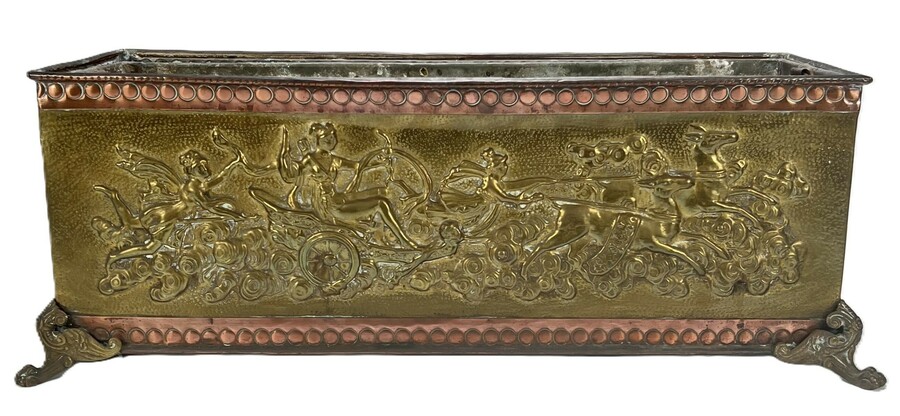 Art Nouveau plantenbak, vervaardigd uit messing met koperkleurige accenten en ijzeren constructiedelen, uitgevoerd in geperst en gedreven techniek. De rechthoekige bak rust op vier geornamenteerde poten en is rondom voorzien van reliëfpanelen met een mythologische wagenvoorstelling met gevleugelde figuren en paarden. Cirkelbandmotieven accentueren de boven- en onderrand, voorzien van een metalen binnenbak. Eerste helft 20e eeuw met een West-Europese herkomst.