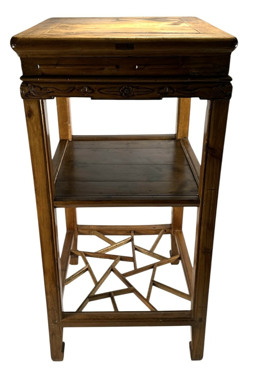 Bijzettafel in Chinees provinciale stijl, vervaardigd uit iepenhout met handmatig houtsnijwerk. De bijzettafel is een getrapt model met drie plateaus, waarbij het onderste niveau is voorzien van een geometrisch 'cracked ice' vlechtwerk. De schorten onder het bovenblad zijn gedecoreerd met gestileerde florale motieven en ranken. Dit meubelstuk dateert van omstreeks 1900 en heeft een herkomst in China.