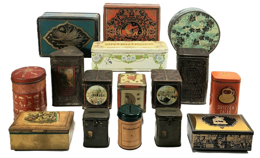Blikken van diverse fabrikanten in eclectische stijlen, vervaardigd uit lithografisch gedecoreerd blik met technieken als reliëfdruk. De verzameling van zestien exemplaren omvat onder andere spaarpotten van de Vrije Universiteit en diverse koek- en cacaoverpakkingen van Driessen. De decoraties tonen stadsgezichten en florale Art Nouveau motieven, daterend uit de eerste helft van de 20e eeuw en een Europese herkomst.