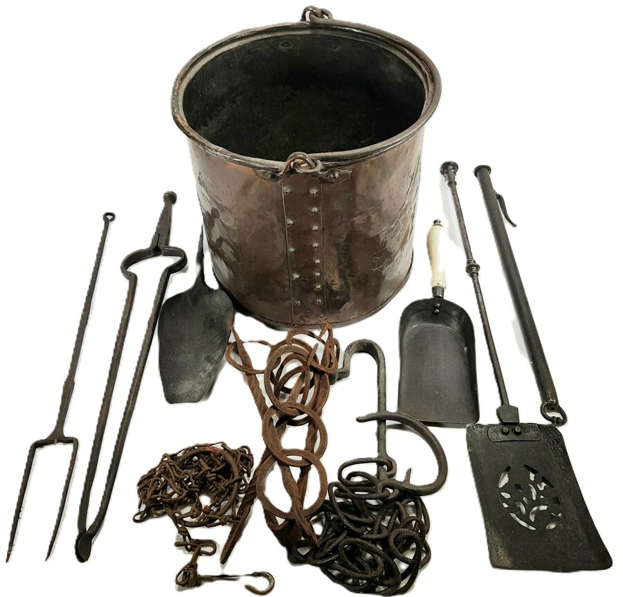Lot in utilitair industriële stijl, vervaardigd uit koper en smeedijzer met gesmede en geklonken technieken. De samenstelling omvat een koperen aker met ovale monding, een smeedijzeren kolenschep met vlak blad, meerdere tangen en haardkettingen met gedraaide schakels. Daterend uit de 19e eeuw en een West-Europese herkomst.