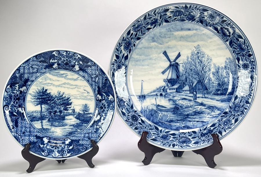 Wandborden van Koninklijke Tichelaar Makkum in traditionele Hollandse stijl, vervaardigd uit handbeschilderd plateel met tinglazuur. De voorstellingen tonen gedetailleerde polderlandschappen met molens en zeilboten in kobaltblauw op wit fond, met florale randdecoraties. Gemerkt aan de onderzijde met het schildmerk en modelnummers. De wandboren dateren uit de 20e eeuw en hebben een Nederlandse herkomst.