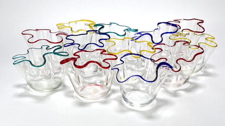 Vaasjes vervaardigd uit geblazen glas volgens het zogenoemde zakdoekmodel. De set bestaat uit twaalf vaasjes met vrij gevormde, golvende randen en transparante corpusdelen, afgewerkt met aangezette glasdraden in rood, blauw, geel en groen. Daterend 1950–1965.