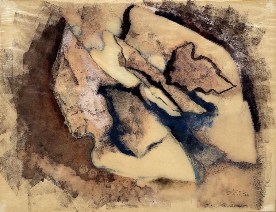 Gemengde techniek door Mascha Braunger toont een abstracte compositie in modernistische stijl, uitgevoerd in inkt en aquarel op rijstpapier gemonteerd op zijde. Het werk kenmerkt zich door organische vormen en een gelaagd kleurgebruik. Rechtsonder gesigneerd, het werk heeft een Zuid-Afrikaanse herkomst.