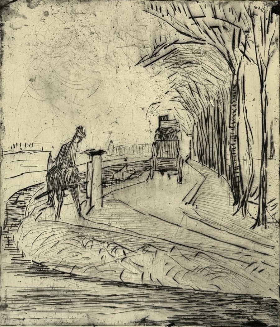 410. Ets, Jan Altink - landschap met rijtuig, eerste helft 20e eeuw