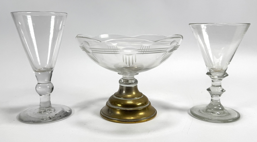 Kelkglazen en coupe in Art Deco stijl, vrijgeblazen uit kristal en met diverse slijpvormen. De coupe rust op een messing voet en heeft een geëtst decor van geometrische lijnen en gestileerde florale motieven. De twee kelkglazen variëren in stamvorm,. Datering 1920–1930 en een West-Europese herkomst.