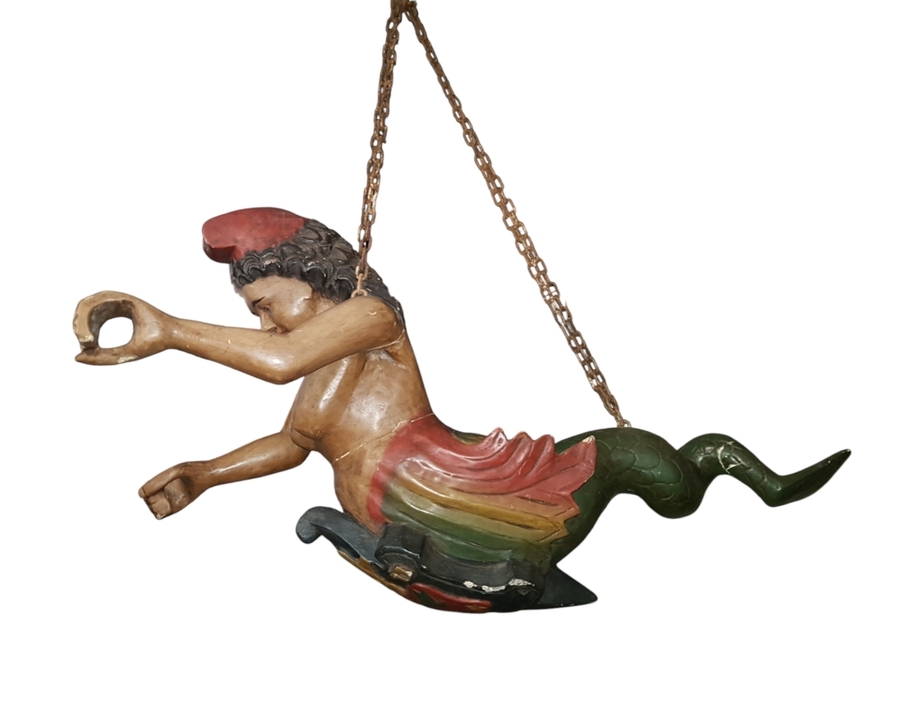 Boegbeeld in 20e-eeuwse maritieme volkskunst, vervaardigd uit hout met gesneden techniek en polychrome beschildering. De voorstelling toont een vrouwelijke figuur met gebogen armen en een geschubd, zeemeerminachtig onderlichaam. Het boegbeeld dateert uit de 20e eeuw en heeft een Noordwest-Europese herkomst.