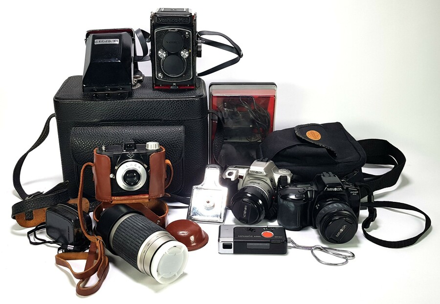 Verzameling van diverse camera's en optische accessoires vervaardigd uit metaal en kunststof met glazen lenselementen. Het lot omvat modellen van fabrikanten zoals Canon en Nikon en een Polaroid Land Camera en diverse telelenzen. Datering tweede helft van de 20e eeuw en een voornamelijk Japanse en Amerikaanse herkomst.