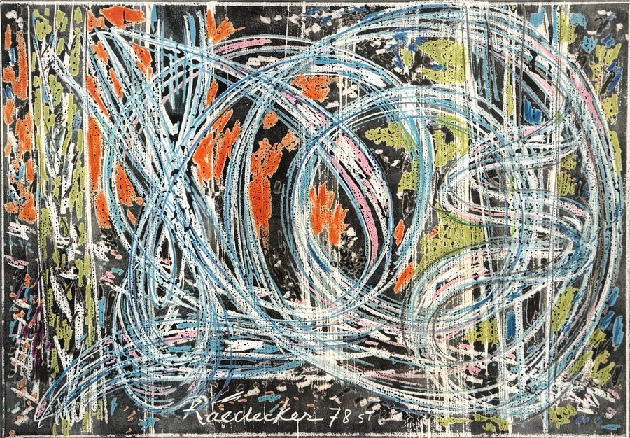Gemengde techniek door Max Raedecker (1914–1987) toont een abstracte compositie met dynamische, ritmische lijnvoering in abstract-expressionistische stijl, uitgevoerd in krijt en gouache op papier. Het kleurgebruik is contrastrijk met helderblauwe en roze lineaire structuren tegen een donkere fond met oker en groene kleurvelden. Midden onder gesigneerd en gedateerd 1978.