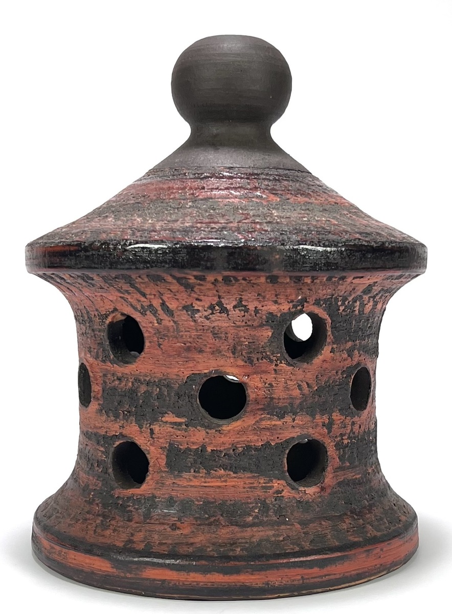 Lampenkap door Potterie Ravelli (1916–2011) vervaardigd uit aardewerk met een opengewerkte techniek van geometrische perforaties. De conische vorm met bolvormige knopdeksel toont een glazuur in roodbruin en zwarte aardetinten. Gemerkt aan de onderzijde met Ravelli en nummer 3 46, midden 20e eeuw en een Nederlandse herkomst.