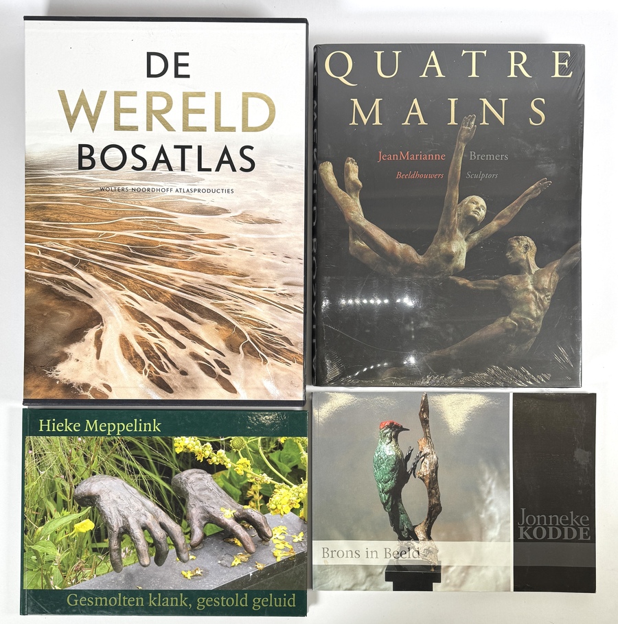 Boeken van diverse uitgevers en kunstenaars waaronder Wolters-Noordhoff en JeanMarianne Bremers in moderne stijl, vervaardigd uit papier en karton met offsetdruk. De kavel omvat De Wereld Bosatlas uit 2004 en monografieën over de bronzen sculpturen van Jonneke Kodde en Hieke Meppelink. De publicaties bevatten reproducties van plastieken en cartografische kaarten.