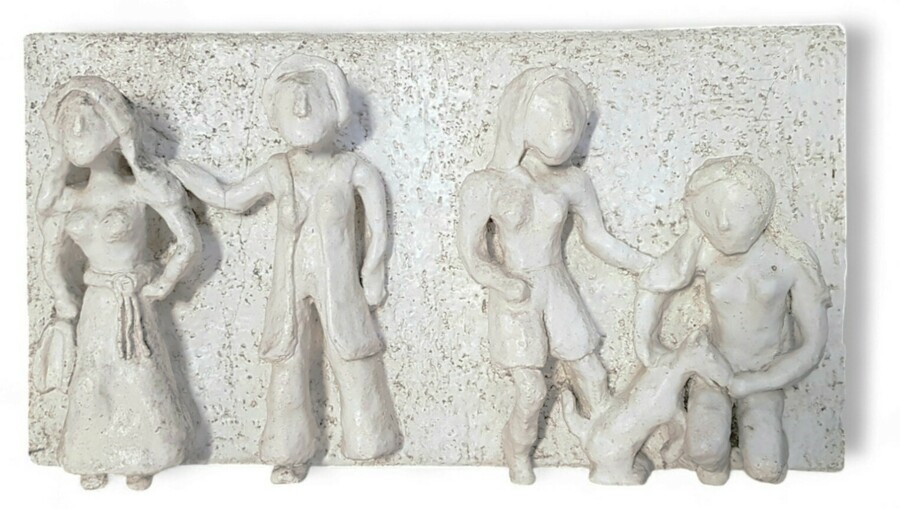 Keramiek reliëf paneel in expressionistische stijl, met een gemodelleerde voorstelling van vier gestileerde figuren met hond. Het aardewerk is handgevormd en afgewerkt met een ruwe gespikkelde witte glazuur. Het paneel is bedoeld als gevelversiering en dateert uit midden 20e eeuw.