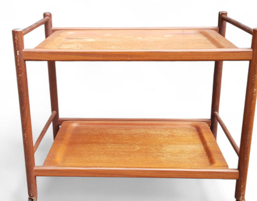 Theewagen uit de Mid-century modern periode, vervaardigd uit teakhout met een open structuur. De serveerwagen is uitgevoerd met twee bladen en staat op messing zwenkwielen. De afwerking van de opstaande randen en het warme houtpatroon typeren het Deens design uit circa 1960. De theewagen heeft een herkomst in Denemarken.