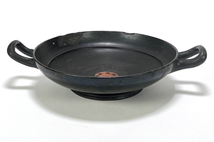 Grieks Attische kylix, 5e eeuw v. Chr., vervaardigd uit gedraaid aardewerk met een diepzwart glazuur. De ondiepe schaal is voorzien van twee horizontale oren en staat op een geprofileerde voet. In het midden van de binnenzijde bevindt zich een tondo gedecoreerd met een cirkelvormig patroon van gestileerde hartvormige bladeren. De schaal typerend voor klassiek Atheens vaatwerk, Europese privécollectie.
