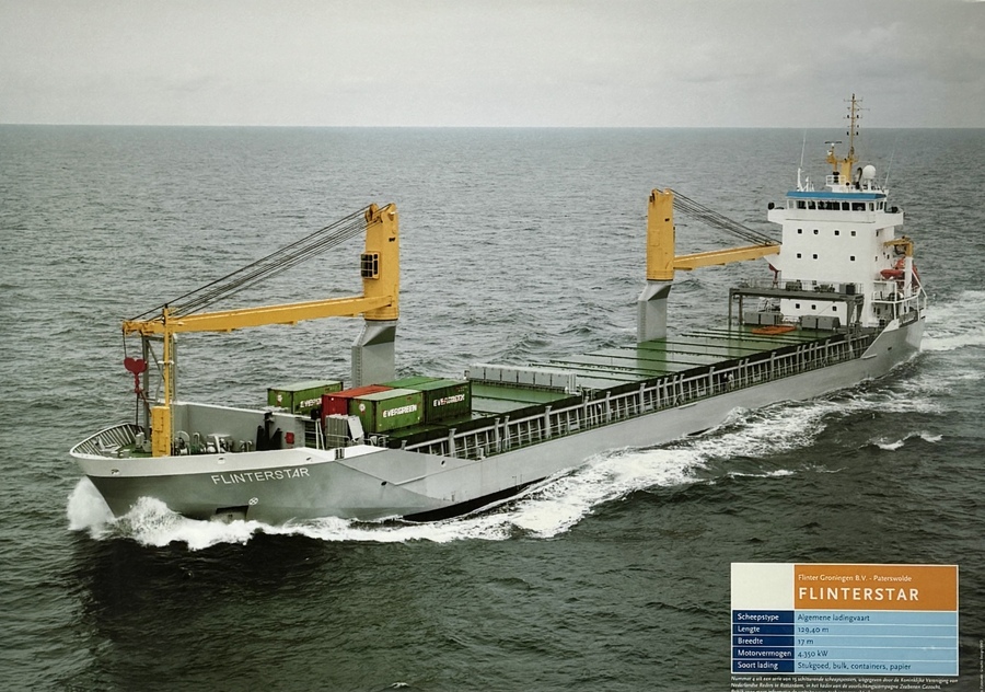 Scheepsposter van Harry Zijderveld in moderne grafische stijl, papier met druktechniek. De poster toont het vrachtschip Flinterstar op volle zee, een voorlichtingscampagne van de Koninklijke Vereniging van Nederlandse Reders. De poster is voorzien van technische specificaties van het vaartuig. Datering: ca. 2002, herkomst: Nederland. De poster zit in een aluminium lijst achter glas.