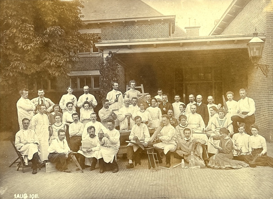 Prent van een onbekende fotograaf toont een groepsportret van een ambachtsschool in documentaire stijl, uitgevoerd in zwart-witfotografie op papier. De authentieke opname dateert uit 1911 en heeft een herkomst in Nederland. Het tijdsdocument toont leraren met diverse ambachtelijke houten gereedschappen op een binnenplaats van de school. Het werk bevindt zich in een houten lijst.