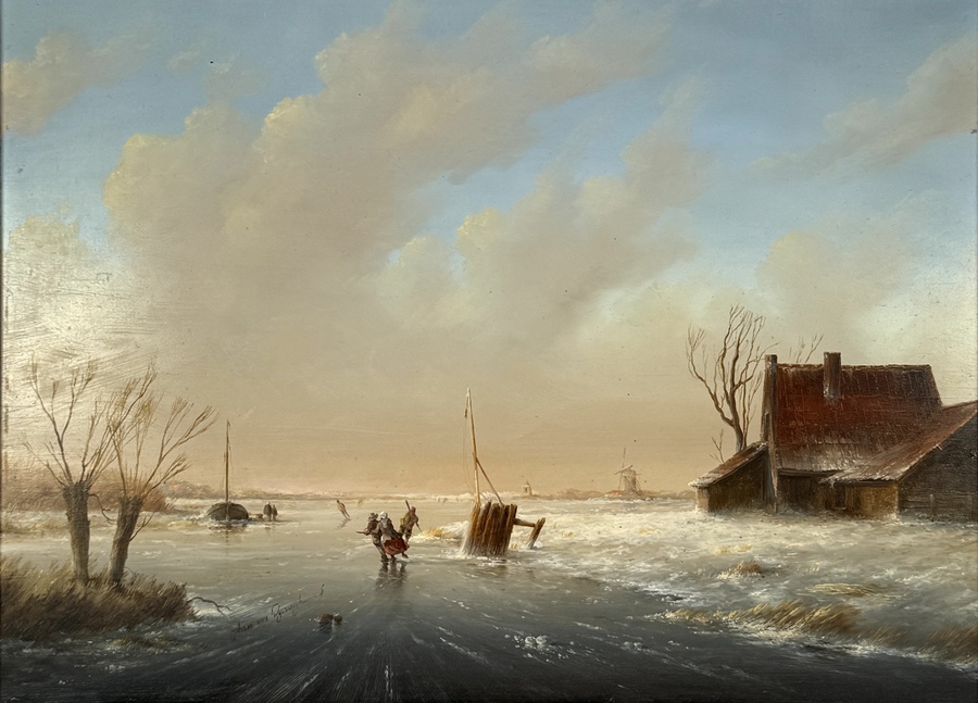 Schilderij door Johan van Rijsswijk toont een wintergezicht met schaatsers en koek-en-zopie, in de stijl van de romantiek, uitgevoerd in olieverf op paneel. De nauwkeurige detaillering van de figuren en de atmosferische lichtinval in de wolkenpartij refereren aan de negentiende-eeuwse wintertraditie. Linksonder gesigneerd, het werk dateert uit de 20e eeuw en heeft een Nederlandse herkomst. In goudkleurige ornamentlijst.
